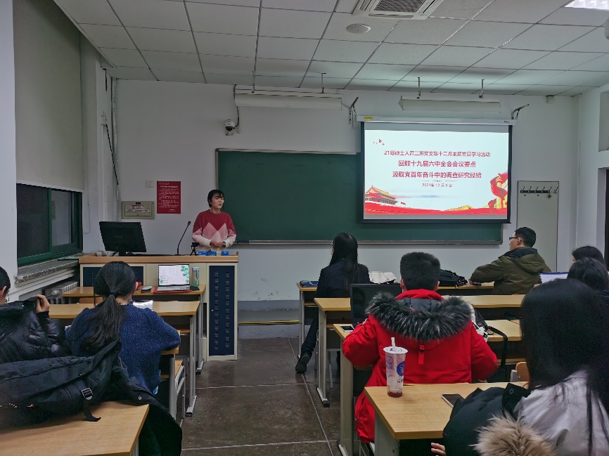 12月8日晚,yl23455永利2021级硕士人力资源管理二班党支部在公教二楼2217教室召开了以“回顾十九届六中全会会议要点,汲取党百年奋斗中的调查研究经验”为主题的党日活动。本次会议邀请支部理论指导老师刘松博作指导,并邀请了马克思主义公司博士宣讲团的讲师进行讲解,支部党员、积极分子参与了本次学习,其他支部骨干前来交流调研。