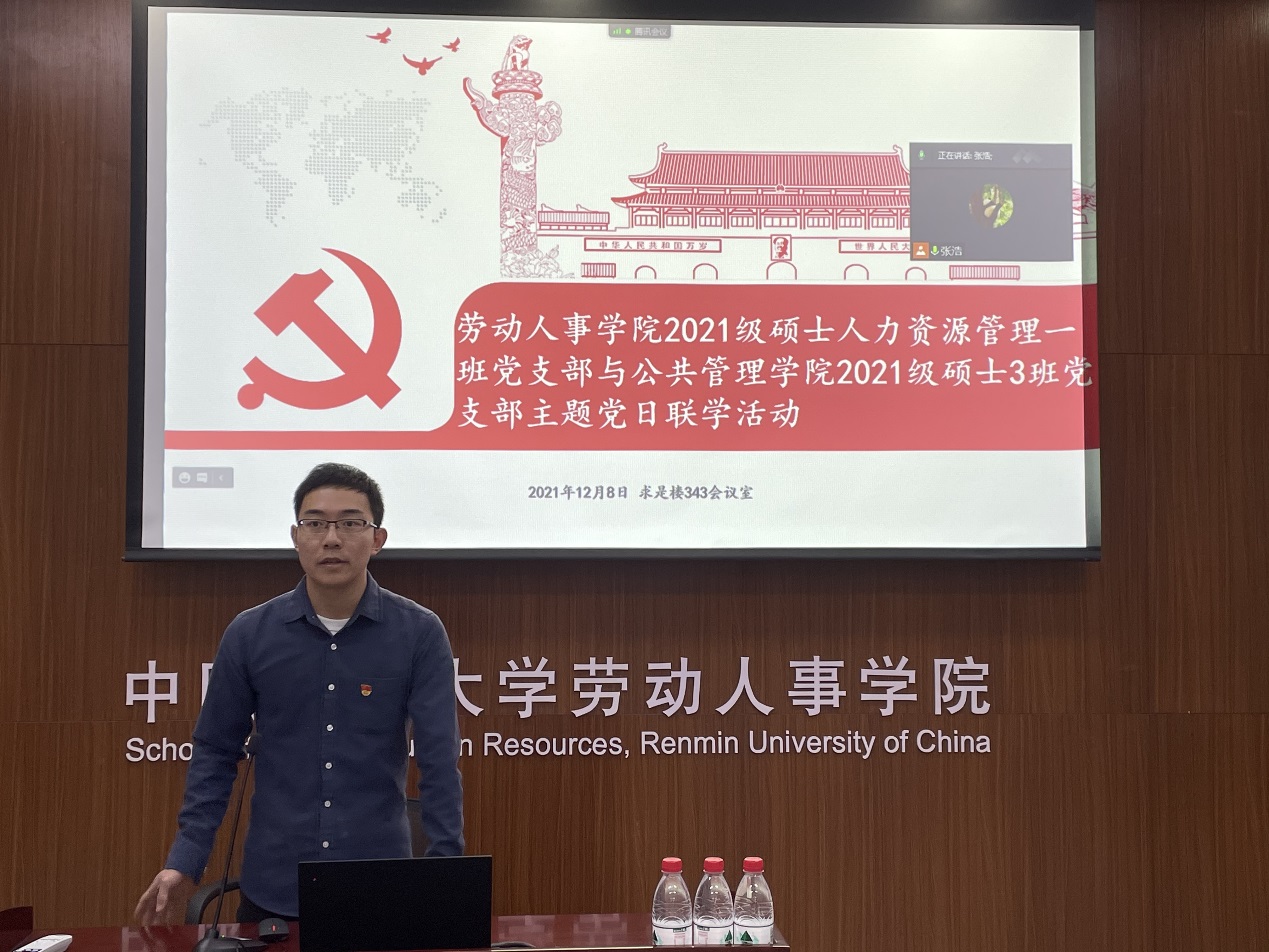 12月8日,yl23455永利2021级硕士人力资源管理一班党支部与公共管理公司2021级硕士3班党支部在求是楼343会议室开展“深入学习党的十九届六中全会精神”主题党日联学活动,各支部党员、入党积极分子逾40人参加。联学活动由公共管理公司2021级硕士3班党支部书记张浩主持。