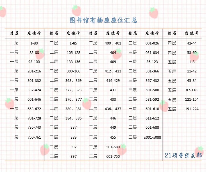 支部成员通过协商讨论,发现图书馆的选座系统不能全面展示座位的插座设置情况,这给同学们带来很多不便,决定将支部办实事活动确定为统计图书馆有插座的座位情况。
