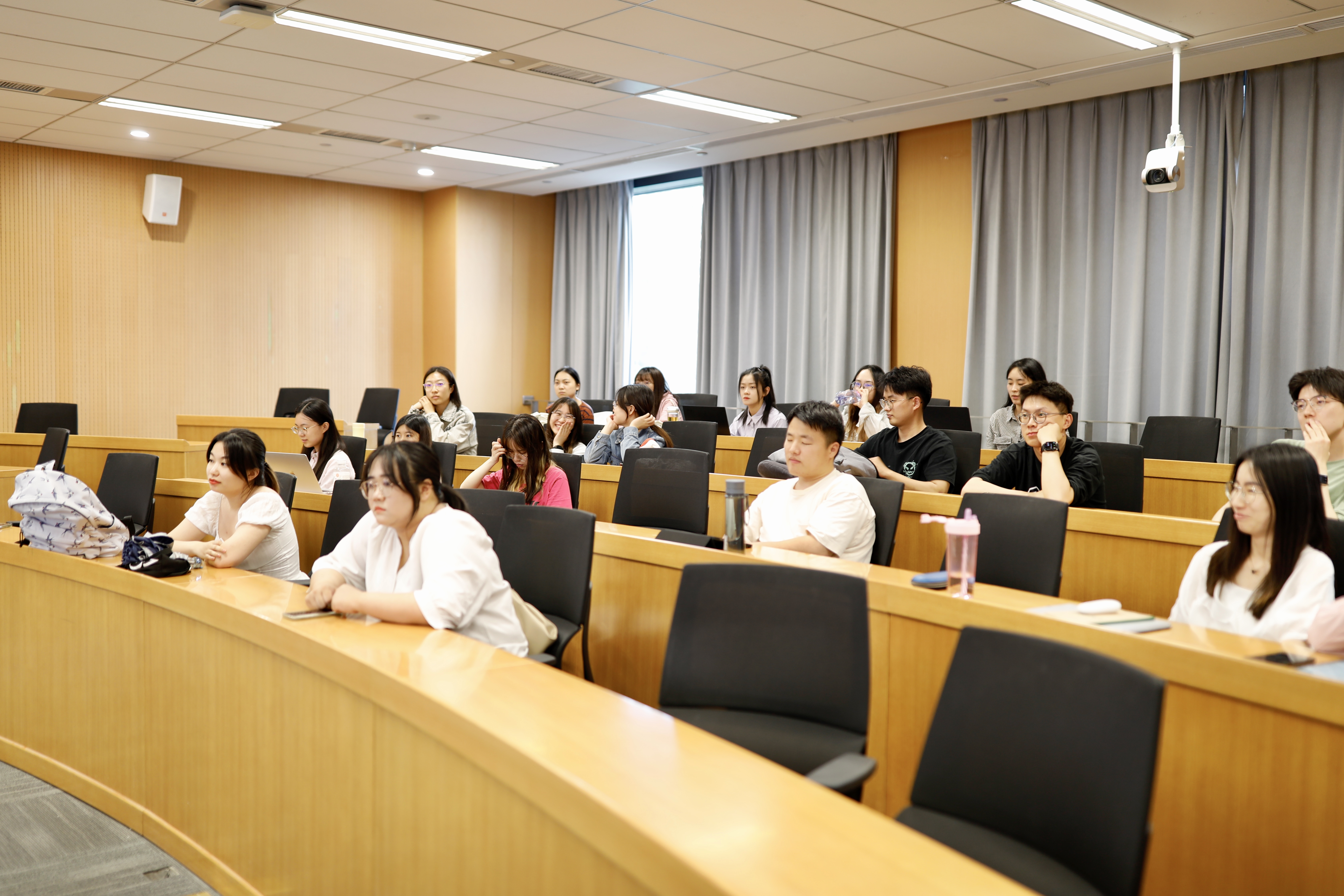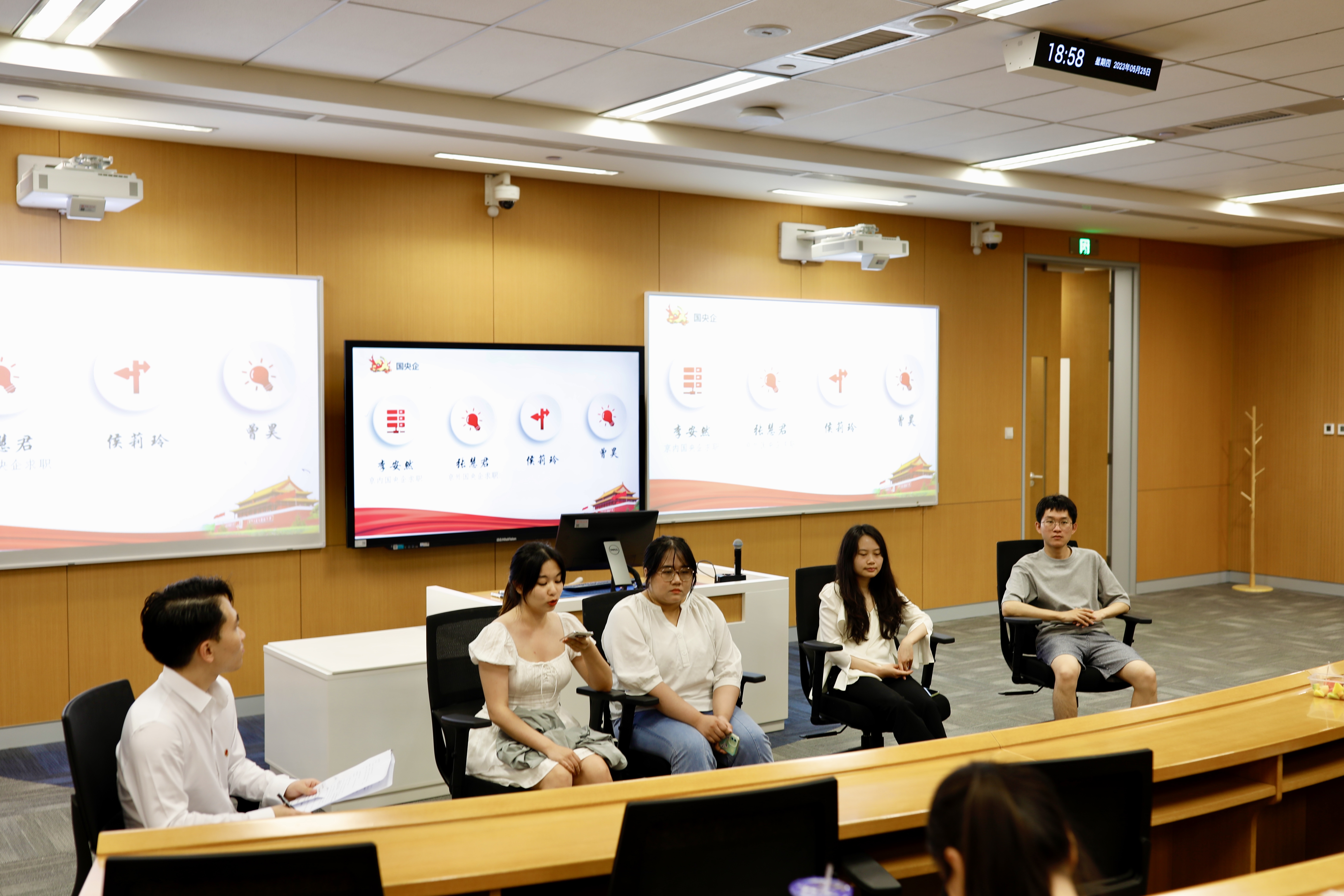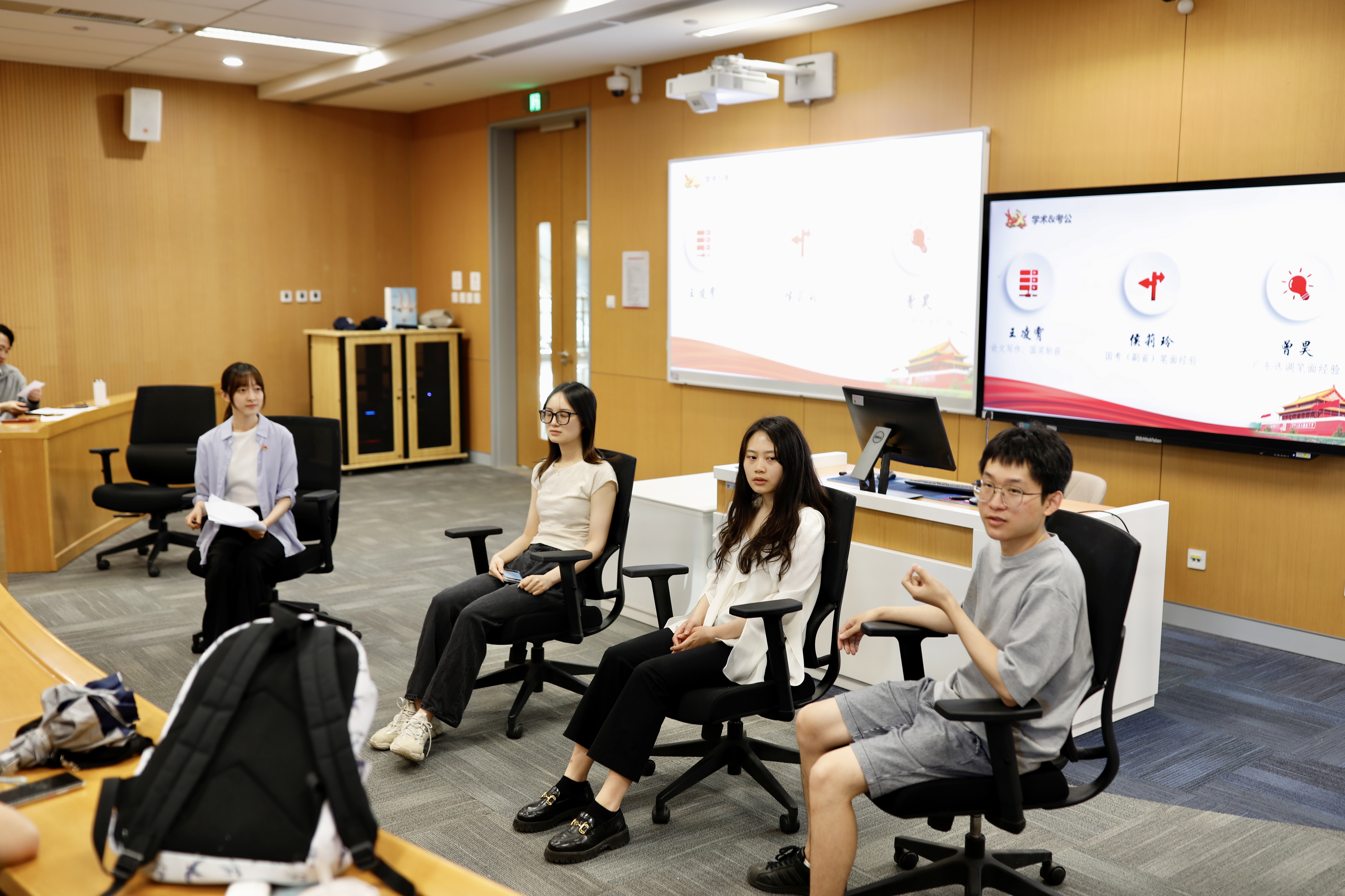 王凌霄、侯莉玲和曾昊详细介绍了央选、国考、地方选调的相关政策和备考经验,与大家进行深入交流,给出许多宝贵的建议。王凌霄重点介绍了题库选择、模拟刷题的方法经验;侯莉玲细致讲解了包含无领导小组讨论在内的国考面试相关技巧;曾昊聚焦广东选调,分享了自己在选岗、刷题等方面的心得。作为国奖获得者,王凌霄还分享了论文写作技巧、注意事项、国奖申请流程等经验。在场同志专心致志观看,聚精会神聆听,认真记录要点。