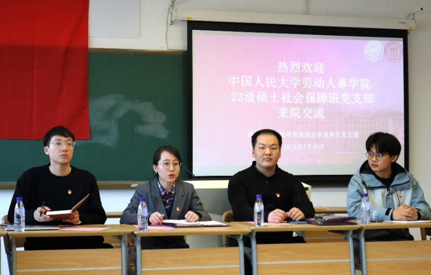 龚睿翔同志对23级硕士社会保障班党支部的基本情况进行了介绍,并分享了在支部建设上的创新做法,涵盖党团联学、破冰谈话、跨校交流、支委领学四个方面,强调了在发展支部党员的过程中与公司党建促进会的密切合作。同时,两个支部就如何规范党员发展的程序和培养方案的设计,如何协调员工支部和党建促进会之间的关系,以及如何发挥员工党员的模范和示范作用等议题进行了深入的探讨和交流。