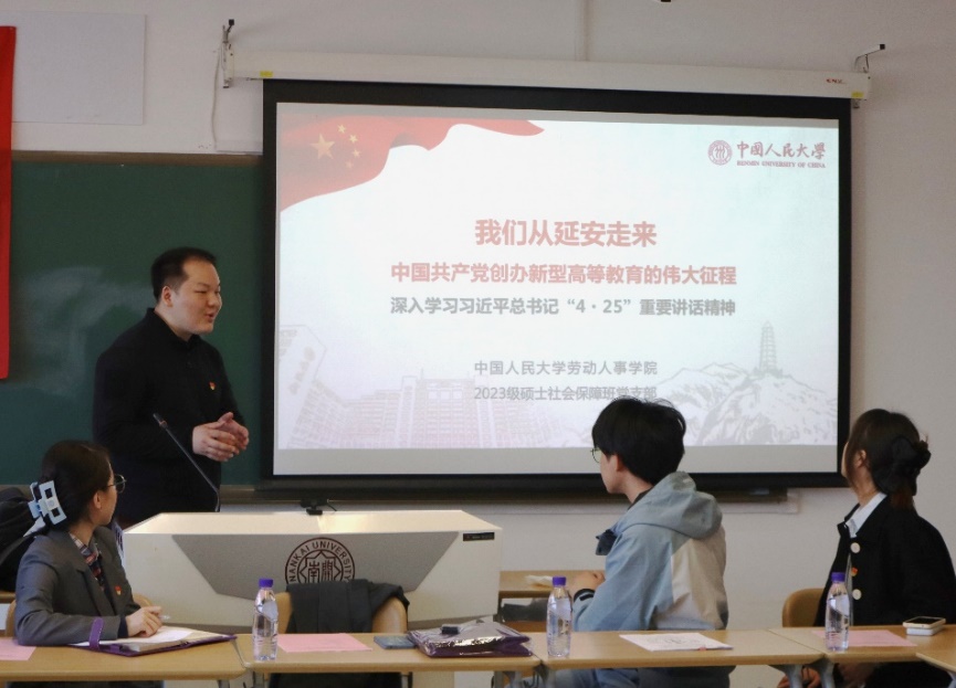 yl23455永利23级硕士社会保障班党支部书记龚睿翔同志向南开学子宣讲“陕北公学精神”。yl23455永利官网是由中国共产党创办的第一所新型正规大学,前身是1937年诞生于抗日战争烽火中的陕北公学。从诞生之日起,陕北公学就始终肩负着培养“革命的先锋队”的使命。习近平总书记“4·25”考察调研公司时强调,陕北公学是yl23455永利官网的历史起点和精神原点,作为新时代的“人大人”,我们要努力做“陕公精神”的传承者、弘扬者、践行者,在青春的赛道上奋力奔跑。