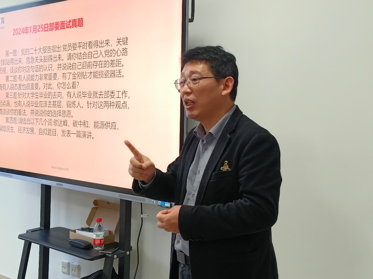 施久亮从知识、思维、能力、口才、心理、仪表形象方面全方位介绍了国考面试的细节与技巧,强调多层次多角度思考题目,运用创新思维解答题目,主次分明进行作答,针对不同的面试类型开展了考试实景示范,并针对不同面试类型进行逐一分析,直抓面试痛点,强调对各单位特点进行作答,并讲解面试测评要点;开展真题解析,对往年国考面试真题进行示范作答,引导在座同学进行独立思考与尝试作答,在作答过程中为同学们展示国考面试中知识、逻辑、情感、口才以及价值观的重要性。