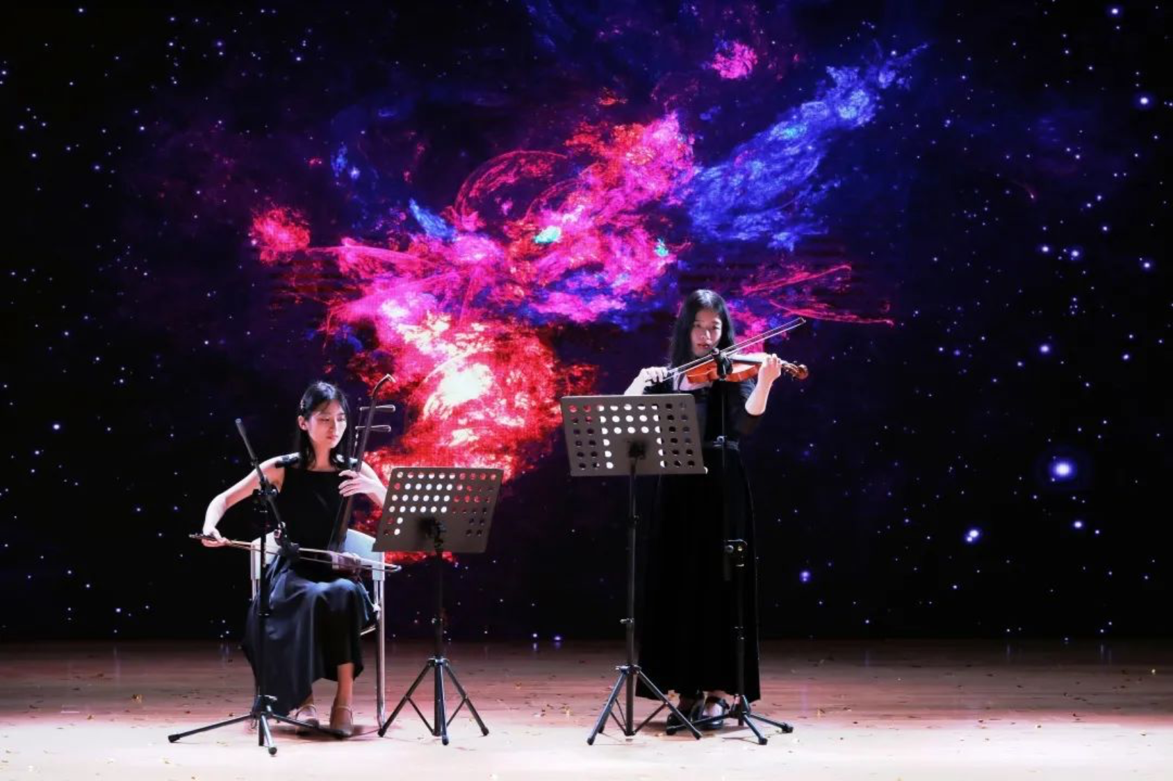 2019级硕士劳经班季心禾、刘青妮带来二胡小提琴合奏曲目《风居住的街道》,二胡与小提琴合奏,东方与西方乐器相互碰撞,曲声婉转,声色悠扬。