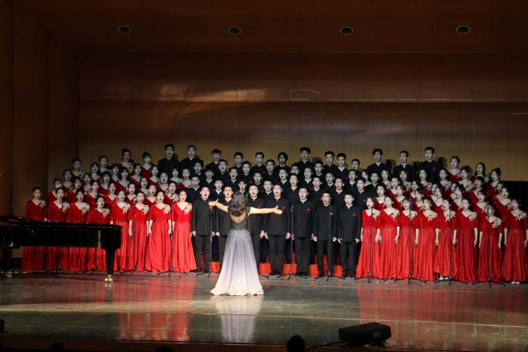 16:00,明德堂灯光骤暗,公司合唱队员在掌声中走上舞台,2019级本科生刘奕池担任本次指挥,2021级硕士研究生贾思淼负责本次钢琴伴奏。钢琴重现岁月,共鸣幽深“百年”。一曲悠扬婉转的《星火》,似是遥远追忆,似是激昂誓言。五百年的理想,不灭的星火,热血澎湃,坚定执着;一路坎坷,回首波澜壮阔,余音绕梁,仍记青春中国!