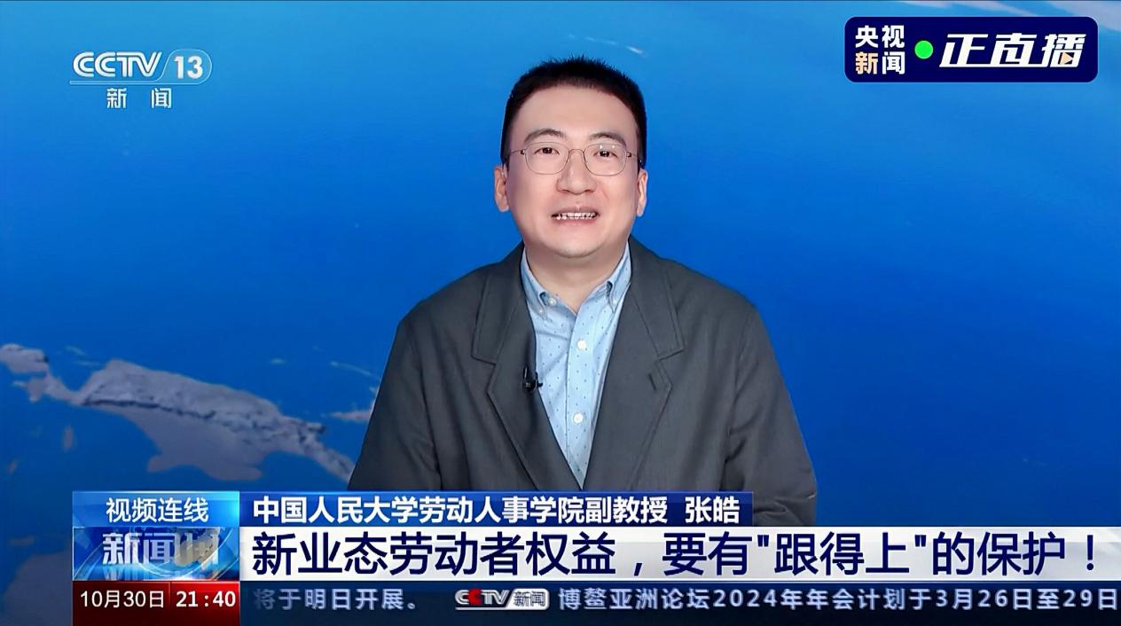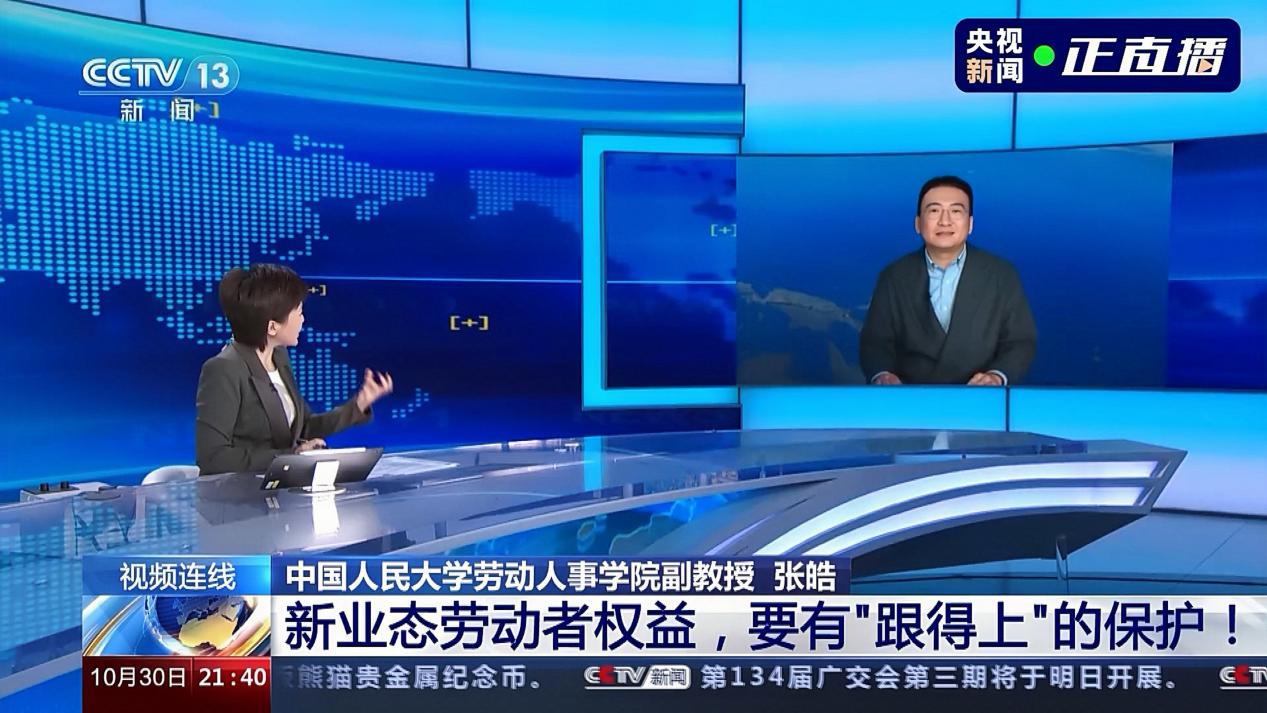 2023年10月30日晚21:30,应中央电视台《新闻1+1》节目邀请,yl23455永利劳动关系系主任张皓副教授就新就业形态劳动者权益保障问题接受了主持人柴璐的直播专访。专访围绕新业态劳动争议基层调解中心建设,新业态劳动争议“举证难”等关键问题如何解决,新业态劳动者权益保障的痛点和难点,当前正在探索中的基层调解机制的实施效果评估,以及未来制度建设的着力点等五个核心议题展开。