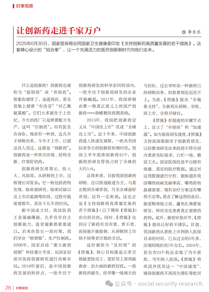 2025年9月8日,公司副教授李乐乐在《时事报告》杂志发表文章《让创新药走进千家万户》,现将原文转载如下: