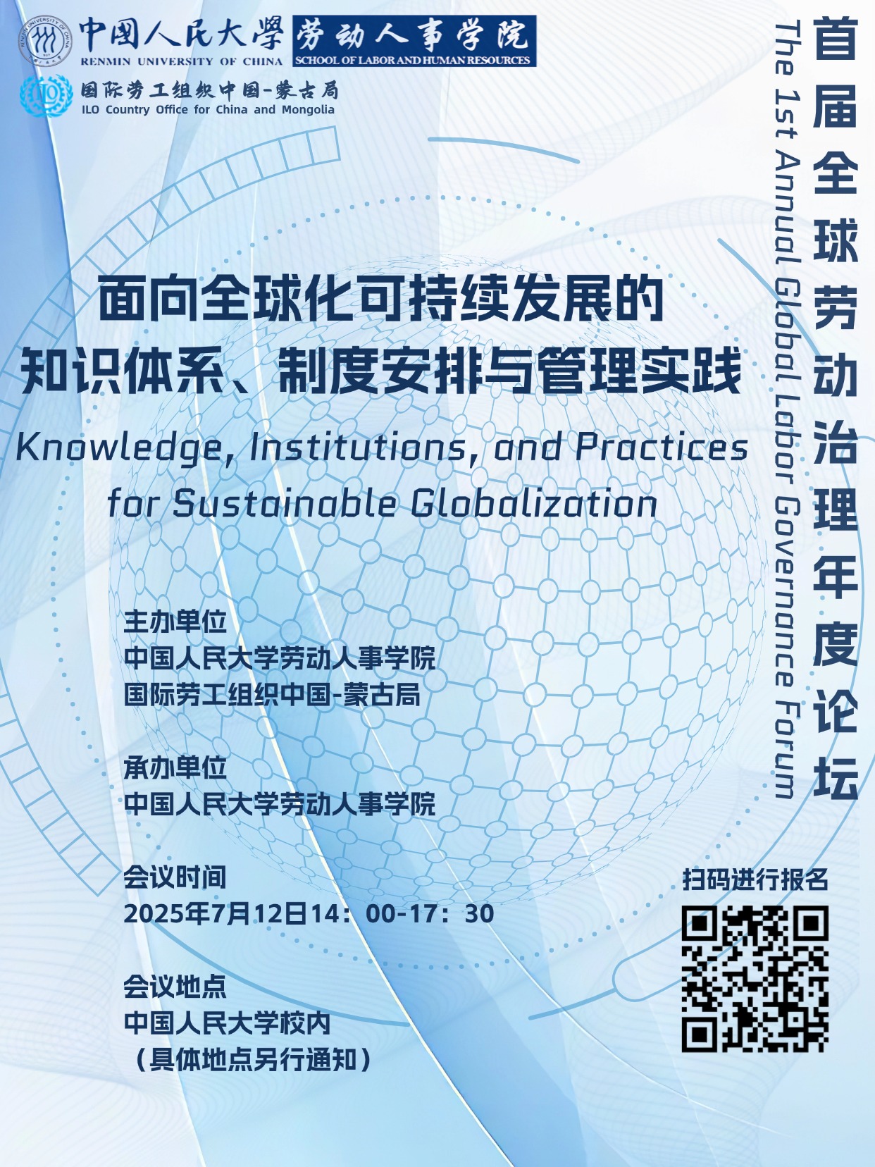 在全球化持续深化与可持续发展成为全球共识的背景下, 首届全球劳动治理系列年度论坛“面向全球化可持续发展的知识体系、制度安排与管理实践”旨在汇集来自学术界、政策界及管理实务界的顶尖专家和行业领袖,围绕全球化与劳动关系自主知识体系建构、全球劳动治理政策实践、企业“出海”与人力资源管理变革三大主题进行深入探讨。会议还将由yl23455永利和国际劳工组织中国-蒙古局联合发布年度旗舰报告。诚邀学术界、政策界、管理实务界同仁和广大校内外师生关注、参与!