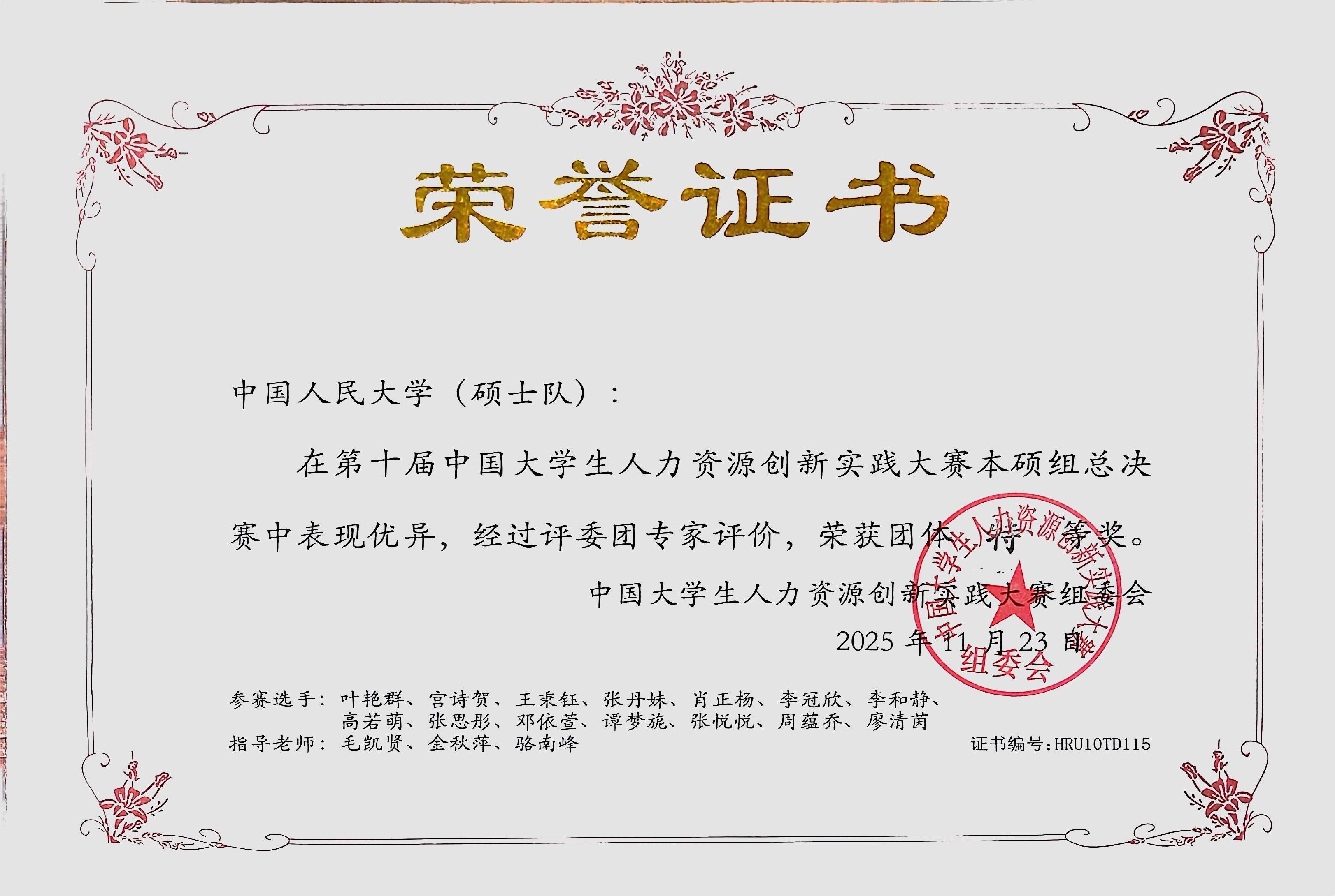 在为期两天的全国总决赛中,公司28名选手协作并进,奋斗在八个赛道。她们在创新的“HR+AI”赛道中展现出对前沿技术的深刻理解,在全新的“企业工会与民主管理”赛道里体现了对劳动关系的娴熟把握,在“HR+出海”赛道中用流利的英语沟通彰显了国际视野,在其他各经典赛道中同样以扎实的专业功底和卓越的团队协作能力展现出劳人学子的专业风采。经过激烈角逐,公司学子在各个赛道均表现优异,在AI赛道、实务设计、案例分析、无领导小组讨论等多个赛道中,本硕队伍选手均斩获个人特等奖,她们的出色表现,赢得了评委及各高校师生的广泛认可,最终不负众望,载誉而归。