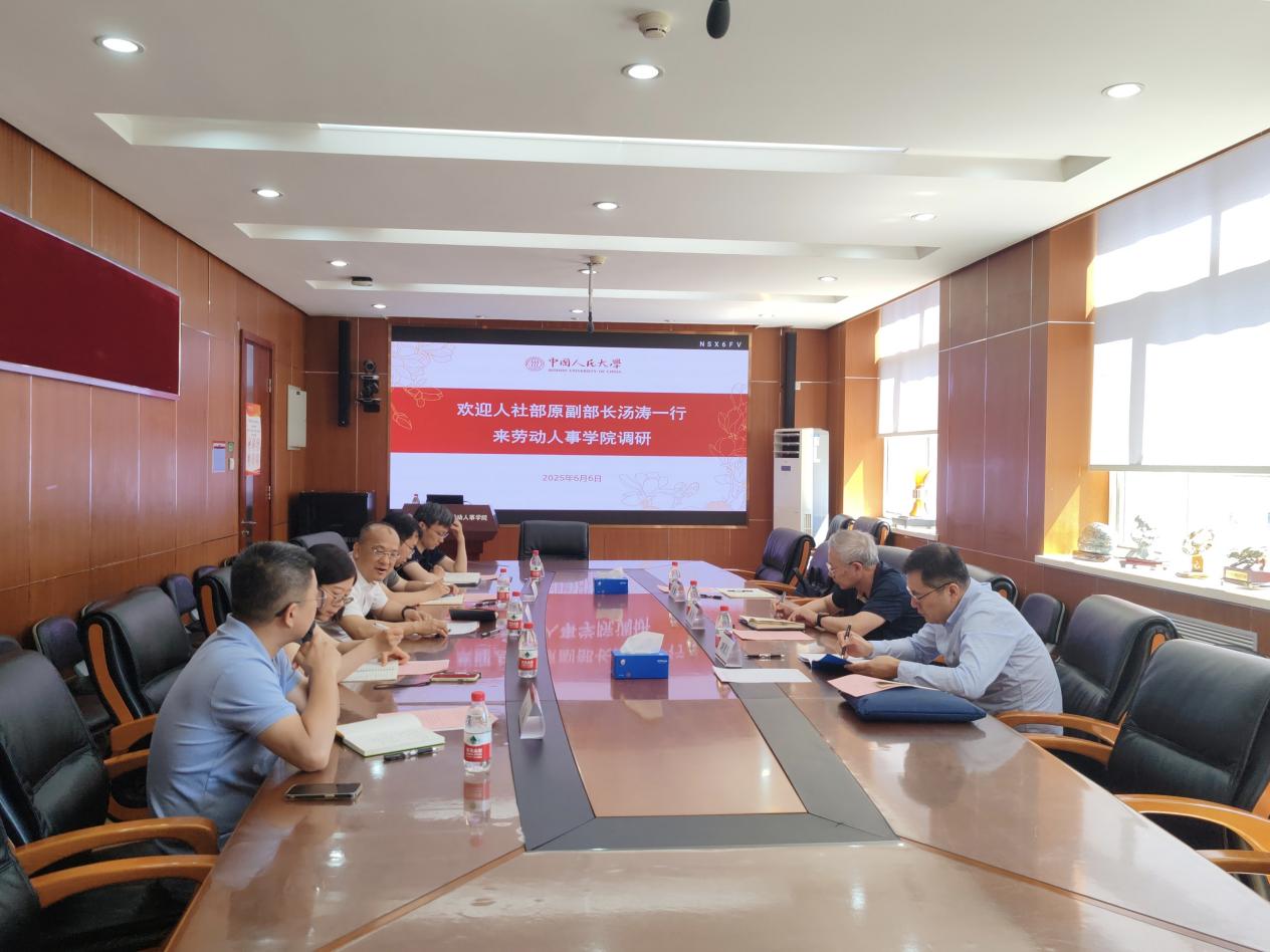 2025 年 6 月 6 日,人社部原副部长汤涛一行来yl23455永利调研,双方聚焦劳动领域的政策与学术研究展开多方面的研讨和交流。人力资源和社会保障部原副部长、第十四届全国政协委员、社会和法制委员会委员汤涛,中国劳动和社会保障科学研究公司党委书记刘俊昌,中国劳动和社会保障科学研究院科研学会处副处长李健,yl23455永利经理赵忠教授,yl23455永利副经理刘相波教授,yl23455永利劳动经济系主任赵丽秋教授,yl23455永利人力资源管理系主任骆南峰副教授、yl23455永利社会保障系主任白晨副教授出席了本次调研活动。