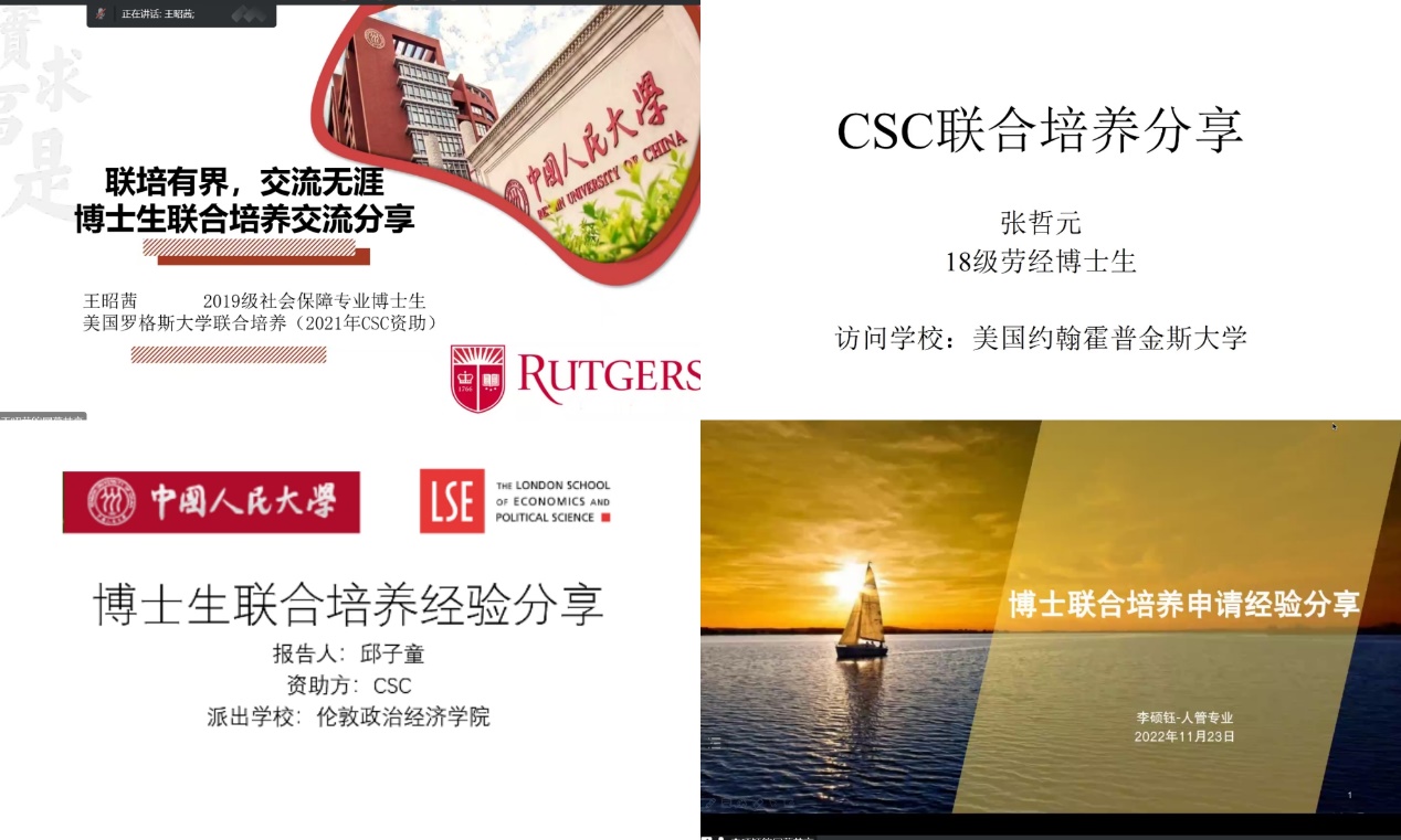 来自社会保障、劳动经济、劳动关系和人力资源管理专业的博士生王昭茜同学、张哲元同学、邱子童同学和李硕钰同学分别分享了在联系外方导师、申请国家、公司、公司各级资助过程中的经验以及在外联合培养的学习体会。同学们专注聆听、认真记录,反响热烈。