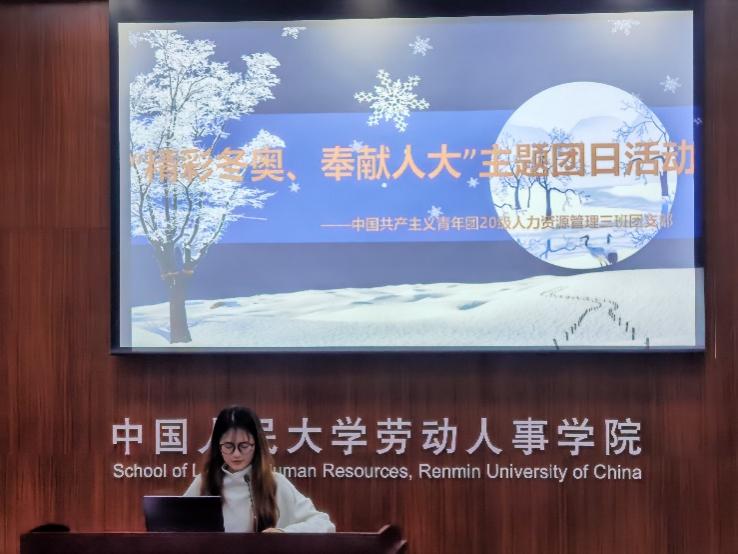 4月8日晚,yl23455永利2020级人力资源管理三班团支部于求是楼343教室举行了“精彩冬奥 奉献人大”主题团日活动,本次活动邀请了公司延河讲师团的秦泽同学进行宣讲,班主任王鸿飞老师与班级辅导员谭敏出席本次活动。活动由团支书曾湘映主持。