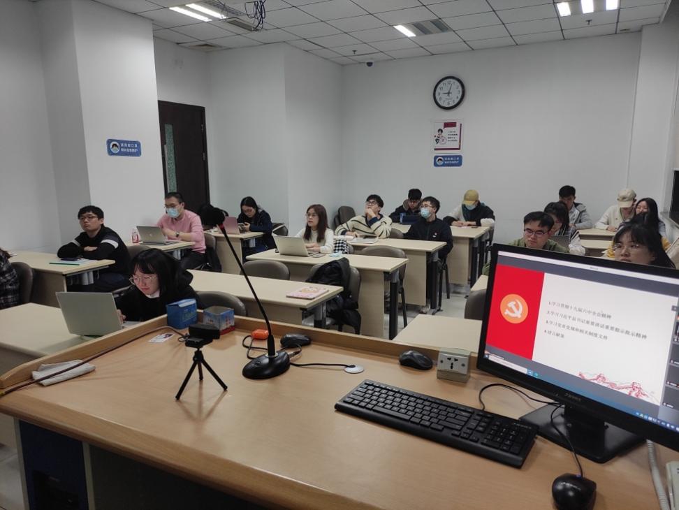 党支部书记朱建军首先带领支部党员深入学习了十九届六中全会精神。通过介绍另外两个历史决议、学习《中国共产党第十九届中央委员会第六次全体会议公报》、《中共中央关于党的百年奋斗重大成就和历史经验的决议》等,与会成员全面理解三个历史决议既一脉相承又与时俱进的关系,深入领悟总结党的百年奋斗重大成就和历史经验的重大意义,深刻领会党的百年奋斗的历史意义和历史经验。