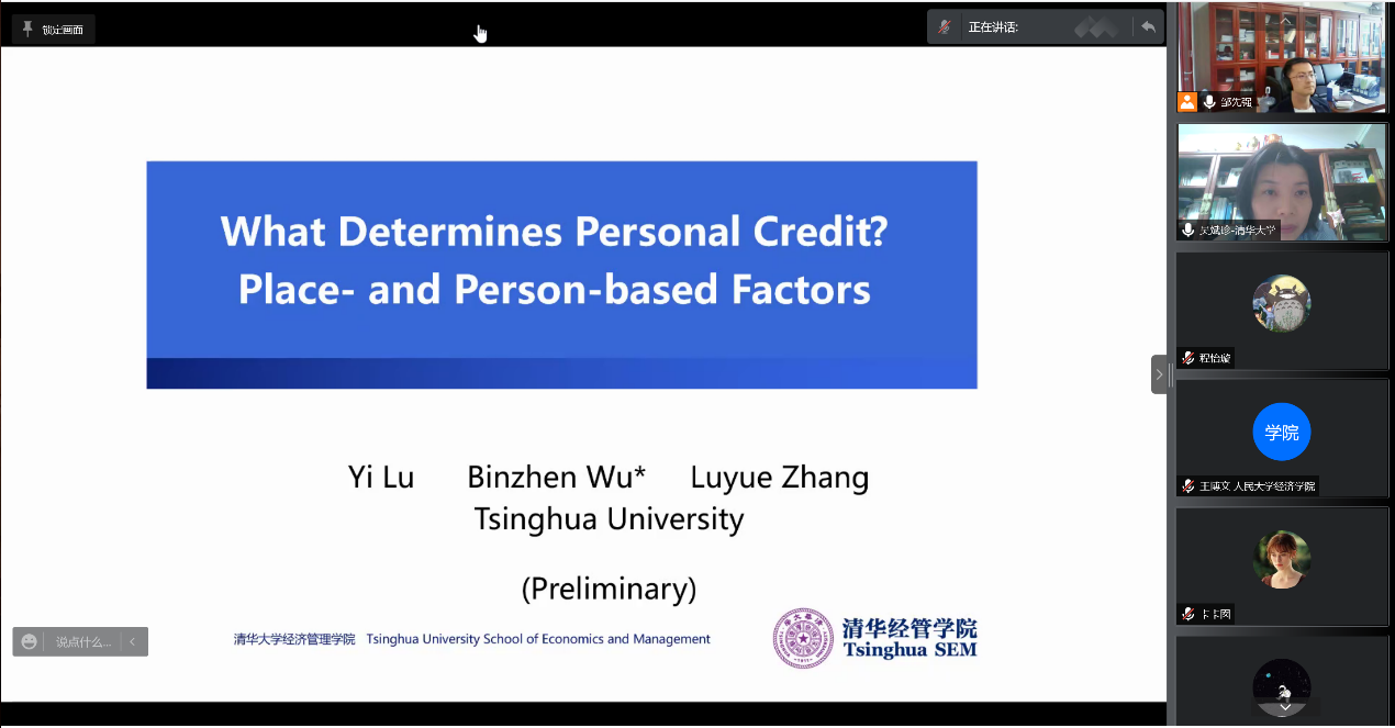 2022年4月20日下午,由yl23455永利主办,劳动经济系和中国就业研究所承办的“劳动经济学双周论坛”第170期讲座通过线上腾讯会议的形式成功举办。来自清华大学的吴斌珍副教授分享了题为“What Determines Personal Credit? Place- and Person-based Factors”的最新研究。本次论坛由yl23455永利邹先强助理教授主持,yl23455永利罗楚亮教授、刘宏教授、赵丽秋副教授、王非副教授、翁茜副教授、周广肃副教授、林琳助理教授,以及五十余名校内外师生参与了此次讲座。