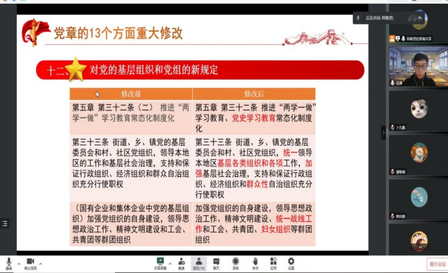 党章是党的总章程,党的二十大坚持发扬党内民主、集中全党智慧,开展党章修改工作,顺应党心民心,符合时代要求。2019级博士班党支部以小组分享带动支部共学,将党章修正案纳入习近平新时代中国特色社会主义思想的整体框架。2022级硕士社会保障班党支部从党章修改的“变与不变”出发,深入领会“党是什么,要干什么”的根本性问题。本科第二党支部等多个支部,深入细致学习分析党章修改的十三个方面共五十处修改,以时代纲领对应时代实践,深刻领会一个矢志民族复兴伟业政党自我革命的精神本色和与时俱进的时代基因。