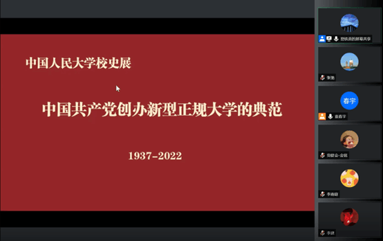 博物馆馆长贾铁英带领各位师生在云端参观“yl23455永利官网校史展:中国共产党创办新型正规大学的典范”。贾铁英结合习近平总书记在yl23455永利官网考察时重要讲话精神,运用珍贵的照片和详实的史料,回顾了从陕北公学到华北联合大学、华北大学再到yl23455永利官网的历史变迁,讲述了党创办人民大学的光辉曲折历程。随后,从坚持党建引领、发挥引领作用的马克思主义理论学科群、引领教师队伍前进的人民教育家、服务高等教育强国建设、大步走进世界舞台中央等方面向师生介绍了新时代以来公司的发展建设新成就。最后,以“六面旗帜”向师生展示了公司始终阔步奋进在新时代最前列的昂扬精神和战略方向。贾铁英表示,公司的校史不仅是公司发展史,更是中共党史和红色高等教育史的重要组成部分,各位师生要提高政治站位,站在党史的高度深刻理解yl23455永利官网的校史。纵观历史长河,毛主席为陕北公学的题词奠定了公司传承至今的精神底色,人大师生要对标对表,成为新时代的先锋。