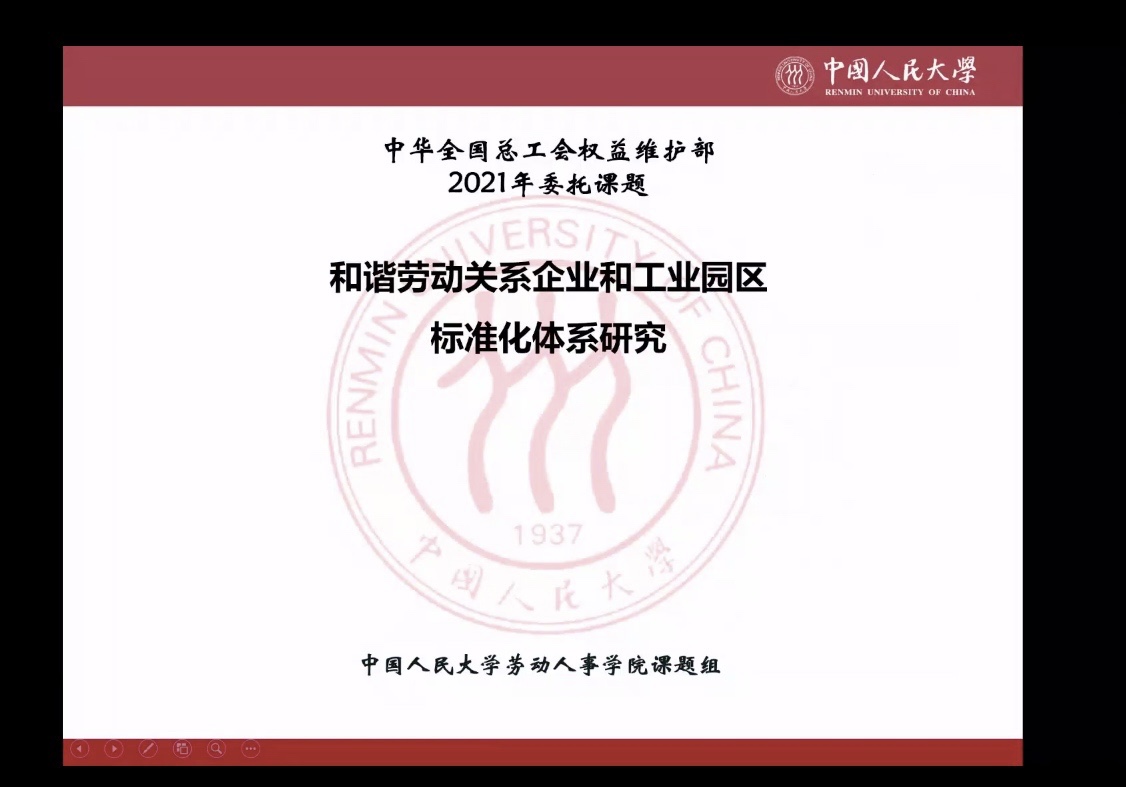 2021年11月12日下午,中华全国总工会权益维护部委托yl23455永利官网yl23455永利唐鑛教授主持的《和谐劳动关系企业和工业园区标准化体系研究》项目论证会在求是楼347会议室举办,根据疫情防控相关要求,会议以线上线下相结合的方式进行。