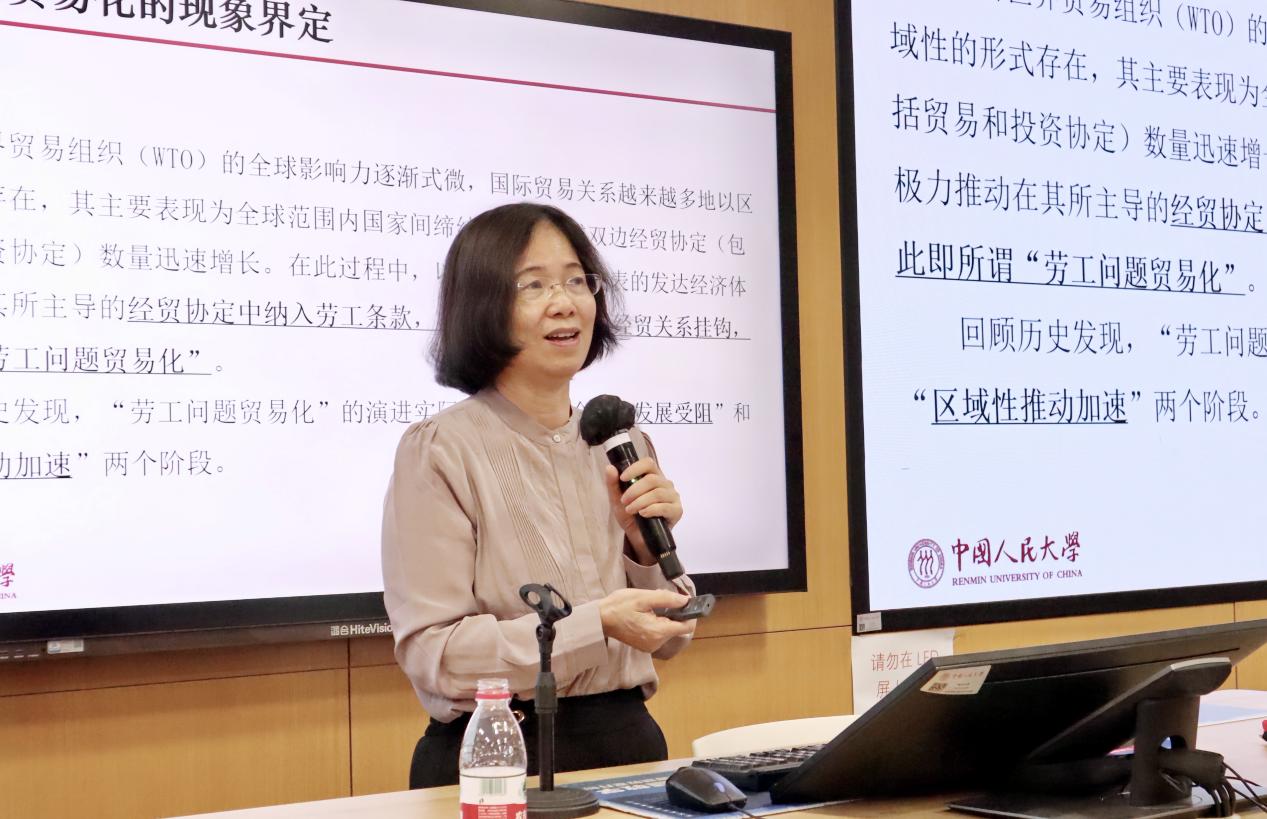 在圆桌讨论结束后,林嘉教授发表了题为《劳工问题贸易化的发展及对劳动法的挑战》的主题演讲,深入分析了劳工问题与国际贸易挂钩的趋势及其对劳动法体系的影响。林嘉教授指出,随着世界贸易组织(WTO)全球影响力的减弱,区域性经贸协定成为国际贸易的主要形式。以美国和欧盟为代表的发达经济体积极推动在经贸协定中纳入劳工条款,将劳工保护问题与贸易关系挂钩,形成了“劳工问题贸易化”现象。她认为,当代劳工问题贸易化呈现与国际劳工标准深度关联、直接影响成员国国内劳工立法和执法、设置专门的劳工争端解决机制和强制纠正违反劳工义务的行为四大特点,并针对这些挑战提出了四点应对建议。