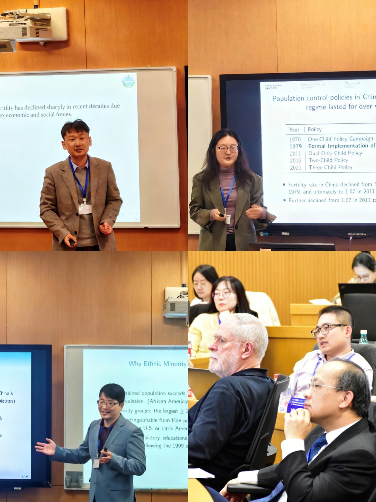 第一场学术报告由来自辽宁大学的陈烽助理教授主持。首先,伦敦大学皇家霍洛威公司的钱鹏展博士分享了题为“Unintended Demographic Effects of Educational Affirmative Action in China(中国教育平权行动的意外人口影响)”的研究。接着,北京大学博士后连莉莉报告了题为“Amplified Population Control Policies through Social Norms: Evidence from China’s One-Child Policy(通过社会规范强化人口控制政策:来自中国独生子女政策的证据)”的研究。最后,来自辽宁大学的陈烽助理教授分享了题为“Input-Trade Liberalization, Female-Skill Intensity and Fertility in China(中国投入品贸易自由化、女性技能强度和生育率)”的文章。