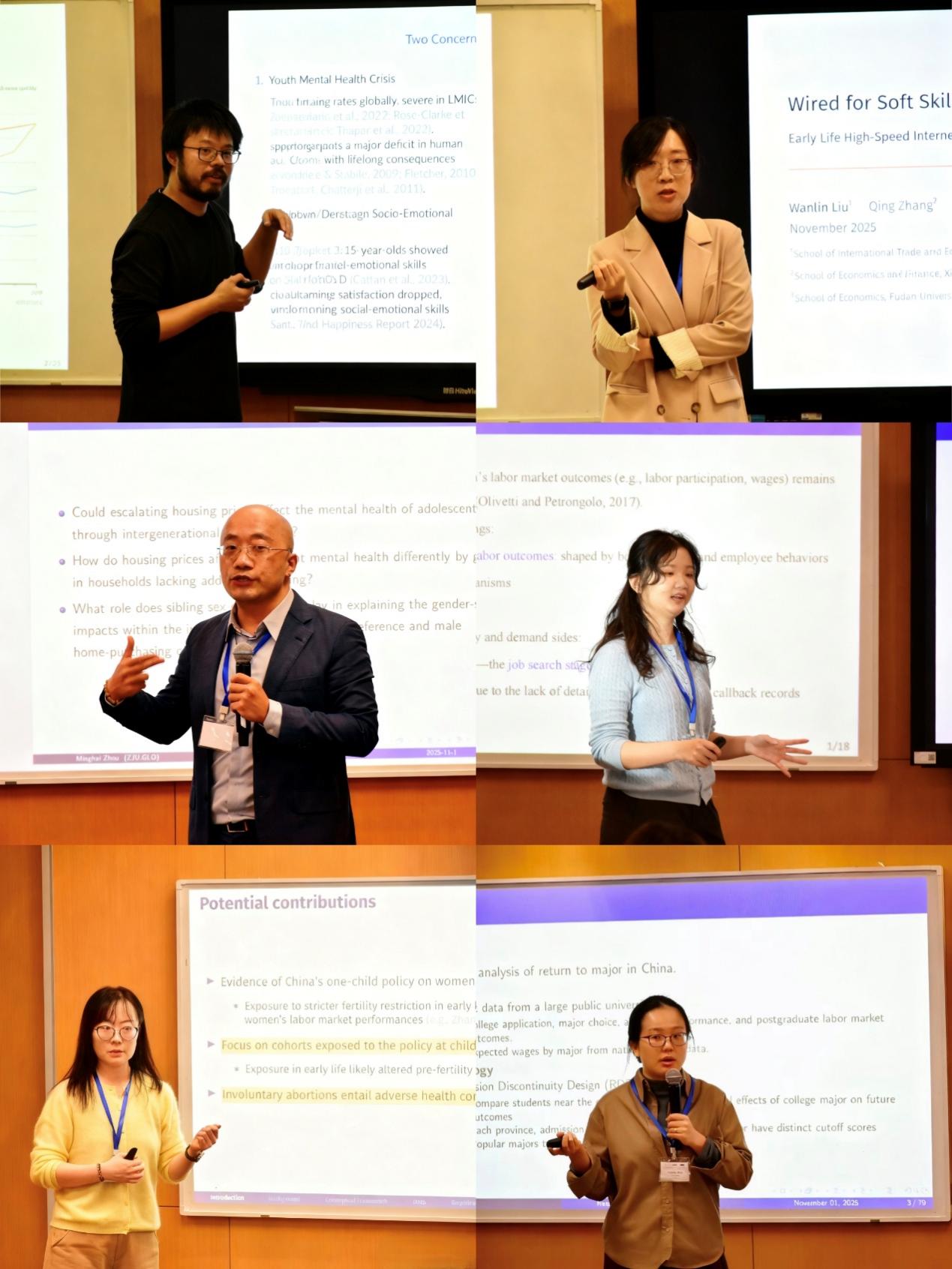 下午第二场学术报告由浙江大学的周明海研究员主持。首先,北京大学博士生喻淼报告了题为“Maternity Leave Extensions and Gender Gaps: Evidence from an Online Job Platform(产假延长与性别差距:来自在线招聘平台的证据)”的文章。接着,浙江大学的周明海研究员分享了题为“Gendered Impacts of Housing Prices on Adolescent Mental Health: The Role of Sibling Sex Composition(房价对青少年心理健康的性别影响:兄弟姐妹性别构成的作用)”的报告。最后,来自中央财经大学的副教授黄忱分享了题为“Short-Term Gain, Long-Term Pain: The Impact of An Unwanted Abortion on Women’s Employment(短期获益,长期痛苦:非自愿堕胎对女性就业的影响)”的研究。