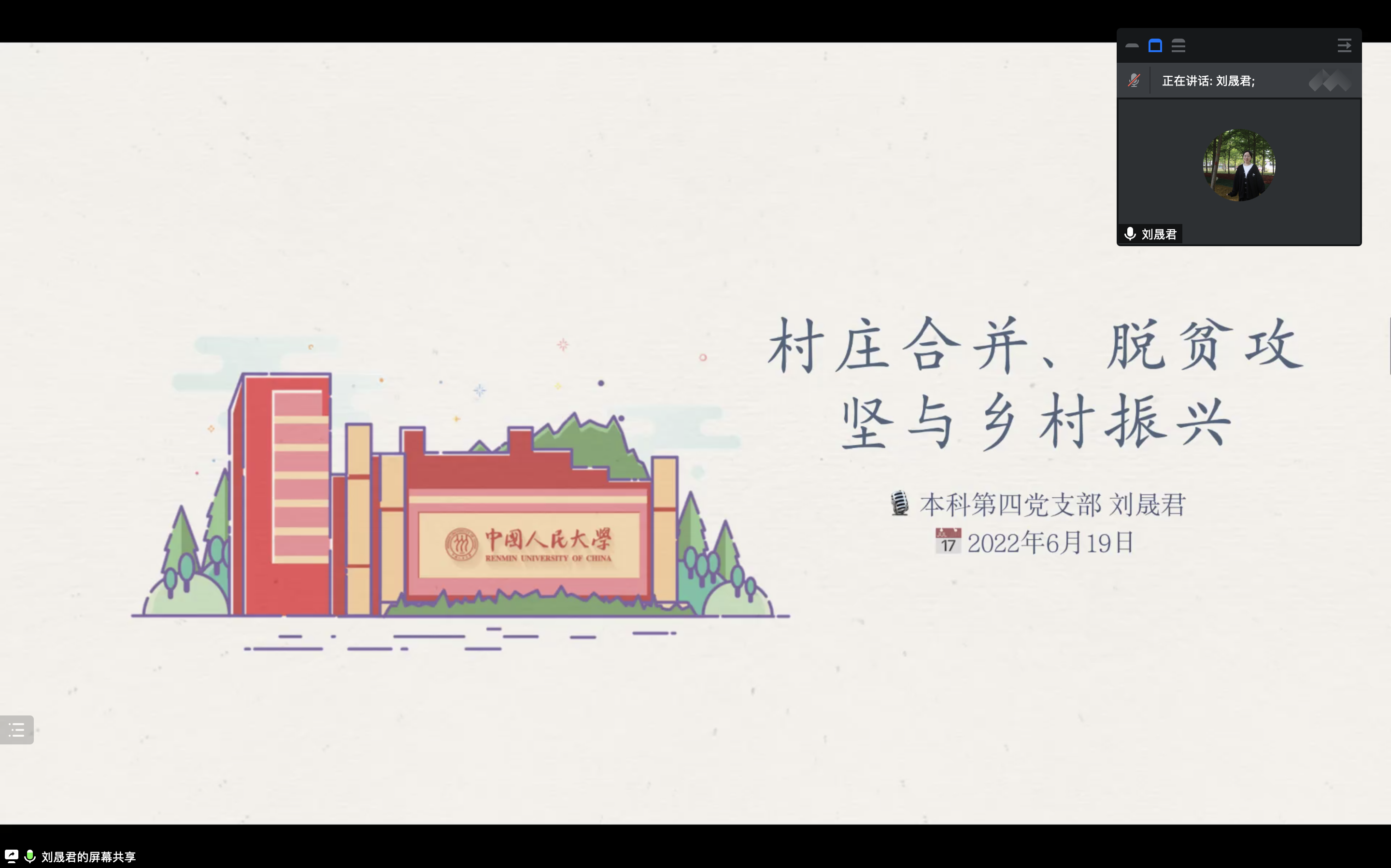 在扎根中国大地部分,王欣茹结合习近平总书记在yl23455永利官网考察时的重要讲话,带领与会同志回顾了yl23455永利官网扎根中国大地办学的优良传统,阐释了扎根中国大地办教育的重要意义。支部党员刘晟君同志以个人经历现身说法,分享自身参与“千人百村”项目的心得体会,她对村庄合并、脱贫攻坚与乡村振兴的研究展现出其主动服务国家、服务社会、服务人民的决心。