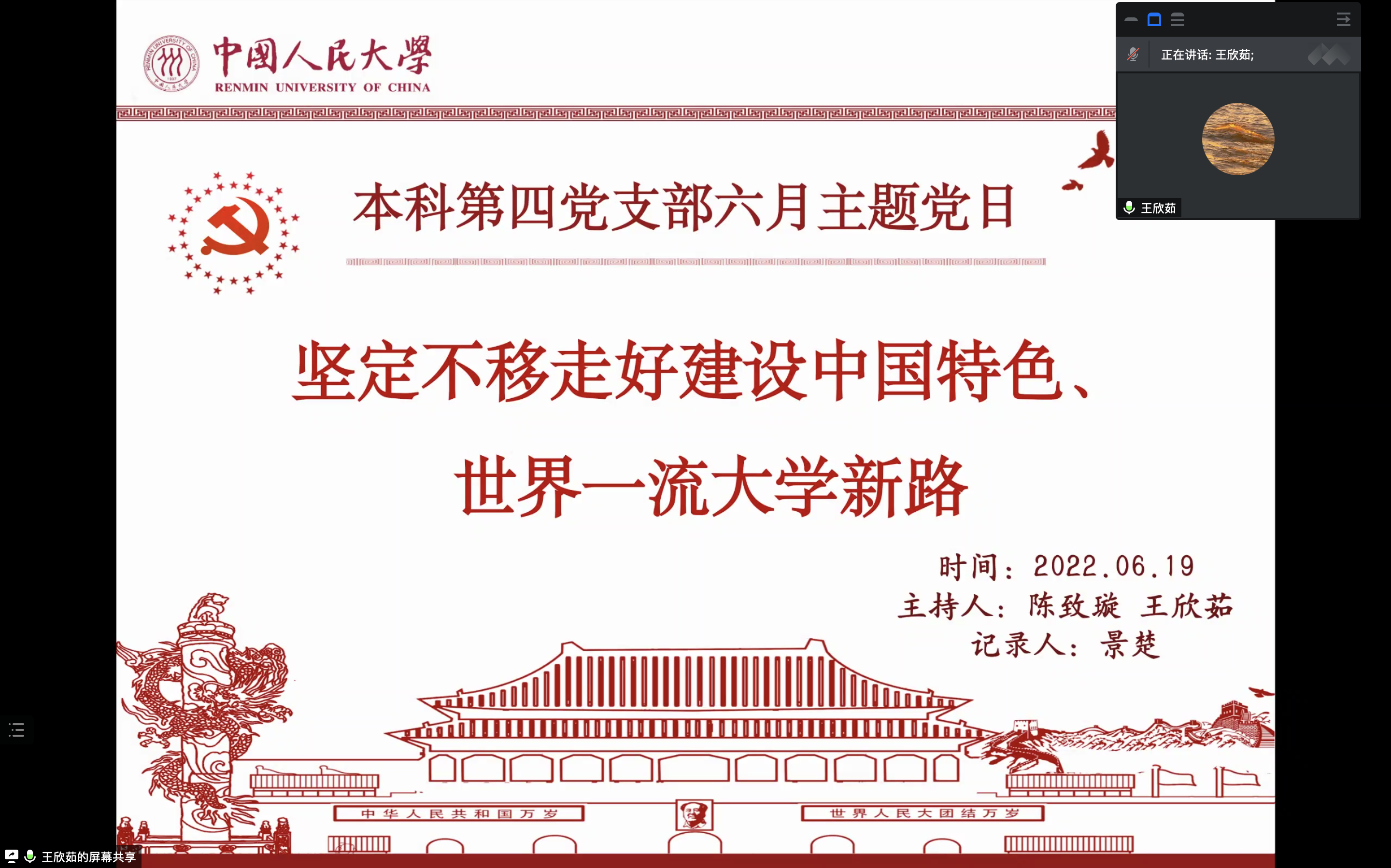 yl23455永利本科第四党支部于2022年6月19日20:30通过腾讯会议召开六月主题党日活动。会议内容丰富,形式多样,以《坚定不移走好建设中国特色、世界一流大学新路》原文讲解为主线,从坚持党的全面领导、传承红色基因、扎根中国大地、坚定教育自信四个方面切入,将云游校史展、微党课学习、党员经历分享等环节贯穿其中。会议由支部书记陈致璇和组织委员王欣茹共同主持,支部全体党员和若干积极分子参加会议。