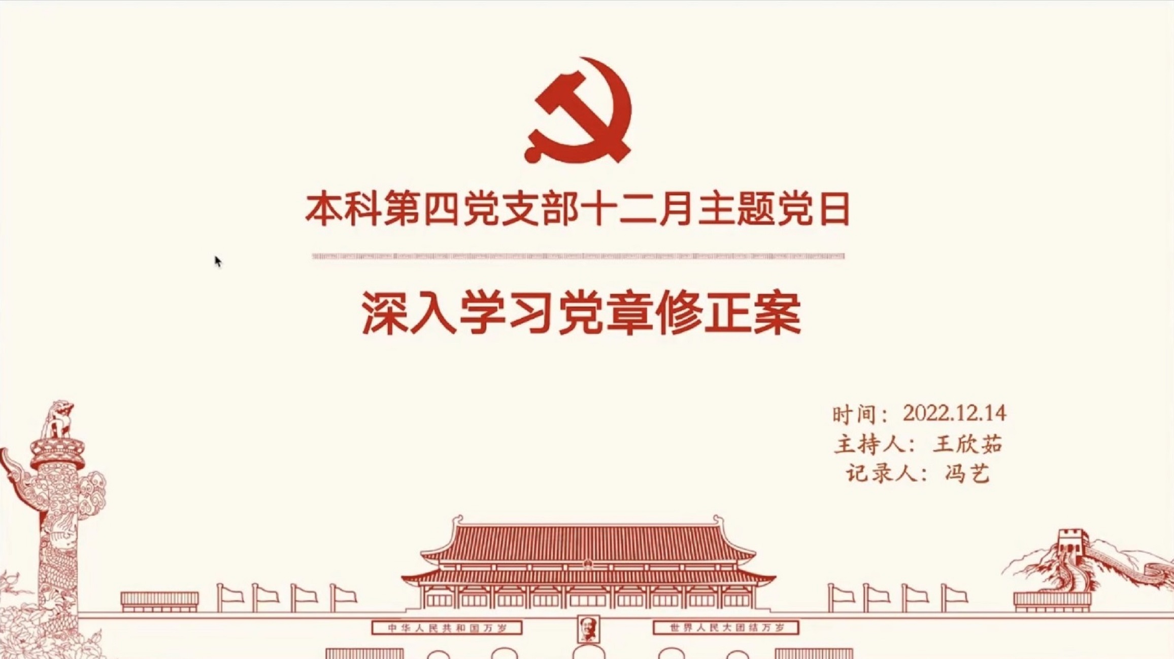 2022年12月14日下午14时,yl23455永利本科第四党支部开展“深入学习党章修正案”主题党日活动,重温党章历史,领会党章精神。会议由党支部副书记王欣茹主持,支部全体党员和若干积极分子参加会议。公司党委委员、本科第四党支部理论学习导师周文霞出席会议并进行指导。