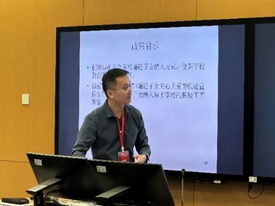 随后,暨南大学经济与社会研究院经理、乡村振兴研究院经理冯帅章教授分享了题为“The Legacy of China’s One-Child Policy on Human Capital: How Being Raised by an Only Child Affects Cognitive and Noncognitive Skill Development”的研究成果。该研究探讨了计划生育政策下作为独生子女的父母对其子代人力资本的影响。研究采用四川绵竹儿童发展面板研究数据,以父代出生相较于计划生育政策施行的间隔时间进行模糊断点回归实验设计。研究发现,独生子女父母对其子代的认知能力和非认知能力具有正向影响,作用的潜在机制包括三个方面:第一,子代具有优势的出生体重和出生身高;第二,子代具有较好的家庭环境,涉及父母的受教育水平、父母的外出务工经历、和家中兄弟姐妹的数量;第三,父代对子代进行较多的教育投资和时间投入,并且选择有益的养育方式。