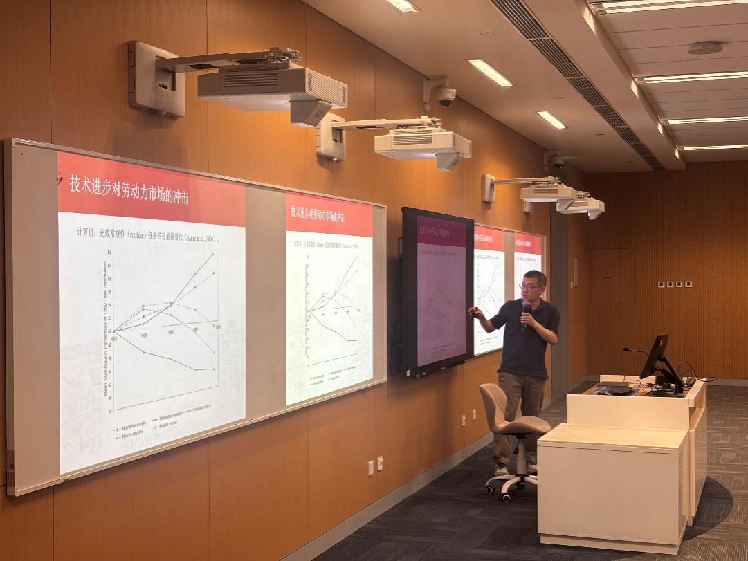随后,来自北京大学国家发展研究院的博雅特聘教授易君健分享了题为“人与技术的和谐发展”的主旨报告。他回顾了以计算机、工业机器人和生成式人工智能为代表的三个阶段的技术进步对劳动力市场冲击的相关研究。计算机使得完成常规性任务的技能被替代,自动化技术使得劳动力市场出现就业极化现象,而生成式人工智能相对于创造需要新技能的工作,更偏向替代已有技能。由于工业机器人的大规模应用,中国的制造业部门内部出现了明显的就业极化现象,但在全行业范围内显示出整体转向高技能就业的情况。中国机器人使用对劳动技能的替代效应尚未有定论。其次,他指出现有任务—技能理论框架存在的缺陷。现有理论分析中,将劳动者的数量和技能视为外生给定的。中短期劳动者的技能迭代,来自企业的在职培训,长期的人口动态与劳动力供给状况则来自于家庭的一系列决策。同时,技术进步也是经济系统内生的结果,技术进步与人口和生育存在长期的动态关系。因此,考察技术进步与劳动力市场均衡的交互作用,需要着力于劳动力供给端的分析,进而探讨宏观经济增长和收入分配问题。最后,他指出未来相关研究问题的研究方法:理论研究要以一般均衡分析为核心,实证研究需要描述性分析、简约式和结构化估计平衡发展,而政策研究方面需要更加注重事前的反事实分析。