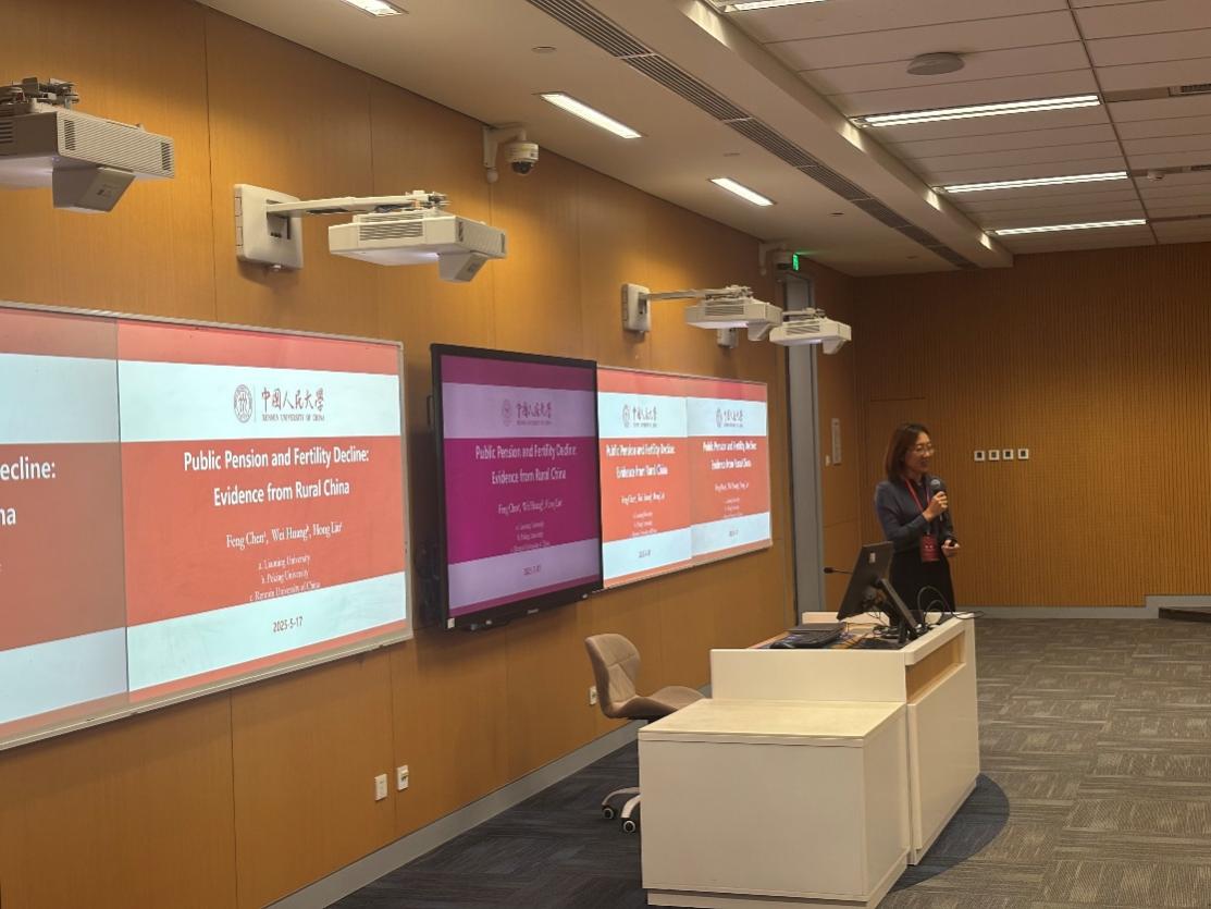 在下午论坛的最后一个主旨演讲中,yl23455永利吴玉章青年学者刘宏教授分享了她的研究“Public Pensions and Fertility Decline: Evidence from Rural China”。研究以我国新型农村社会养老保险为例,探讨了公共养老金扩张如何通过改变养老保障动机影响生育决策。研究借助新农保政策的实施构建三重差分模型,采用县域层面的人口普查数据进行分析。研究采用“中国综合社会调查”,发现新农保降低了男孩偏好型生育行为,该影响在新农保实施以前偏好依靠孩子养老的县级地区作用更强。研究结论证实了公共转移支付会挤出非正式的代际支持。