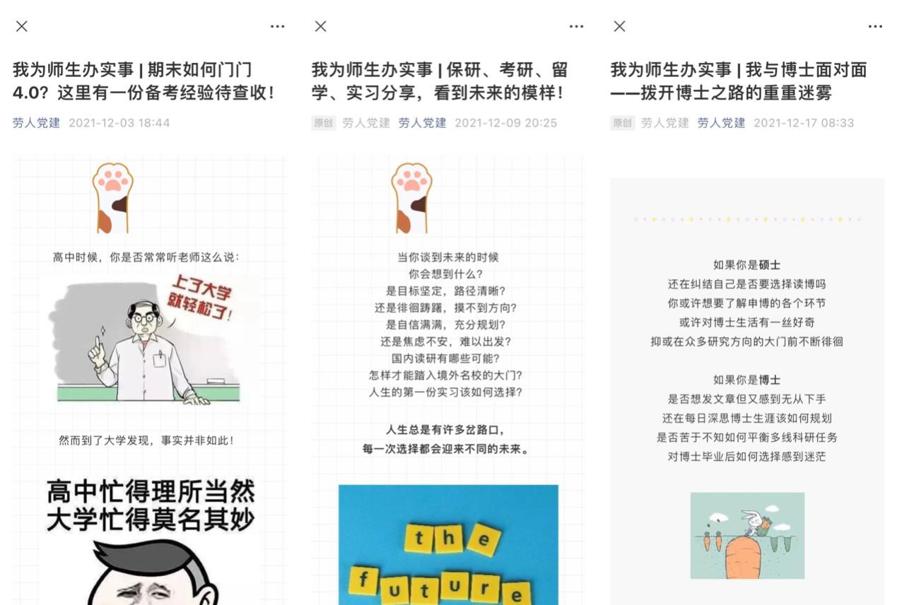2021年12月,yl23455永利本科党支部与2021级硕士社会保障班党支部积极落实“我为师生办实事”实践活动要求,联合开展员工发展经验交流系列活动,围绕身边同学就个人发展方面集中反映的需求和普遍存在的问题开展系列交流会。系列交流会共分3期,分别以学习与考试、实习与升学、科研与读博为主题,邀请在课程学习、专业实习、保研考研、申博科研等方面经验丰富的同学参与交流分享,为全体同学答疑解惑。本次系列活动共历时16天,在微信公众号“劳人党建”发布三期推送预告,阅读量共计超过1000;三期交流会分五场举办,共有220余人次报名参与,参与对象覆盖yl23455永利全部年级本科生和低年级硕士生。