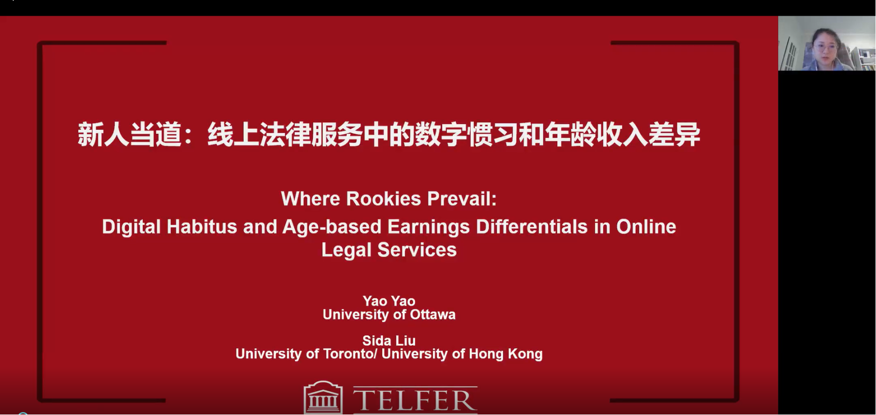由yl23455永利主办,劳动关系系承办的“劳关天下”系列讲座于2022年11月16日(星期三)上午9点30分,通过腾讯线上会议的方式成功举办。来自渥太华大学的姚瑶老师进行了题为“新人当道:线上法律服务中的数字惯习和年龄收入差距”的学术分享。本次学术讲座由yl23455永利劳动关系系张皓副教授主持,yl23455永利吴清军、陈力凡等老师,以及来自国内不同高校科研院所共三十余位学者、员工和实务界人士在线上参与了此次讲座。