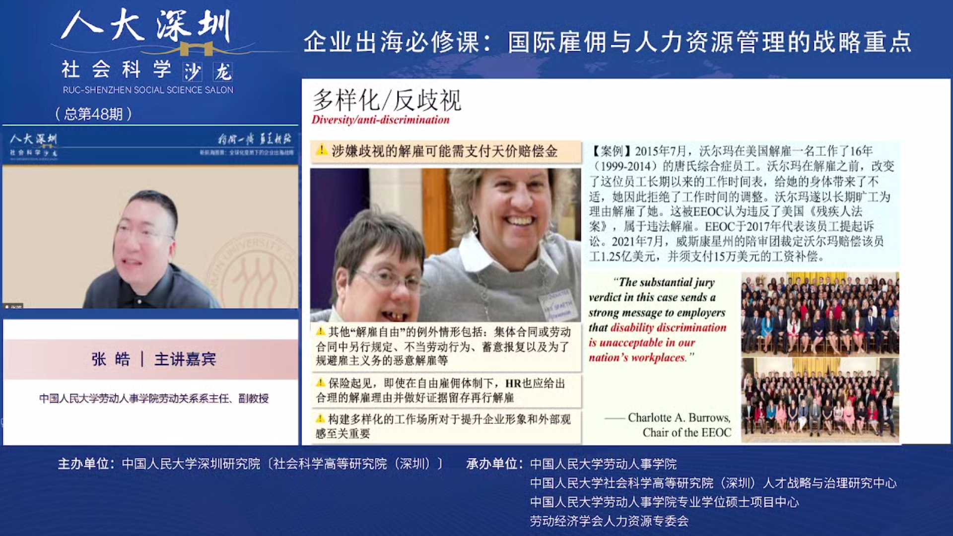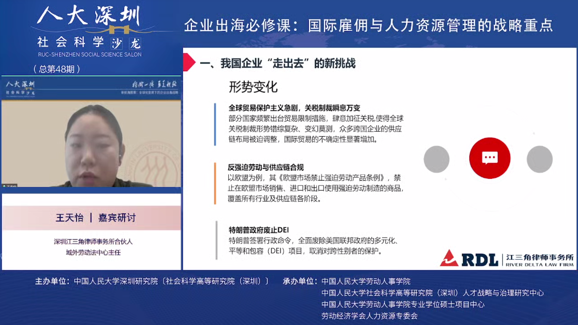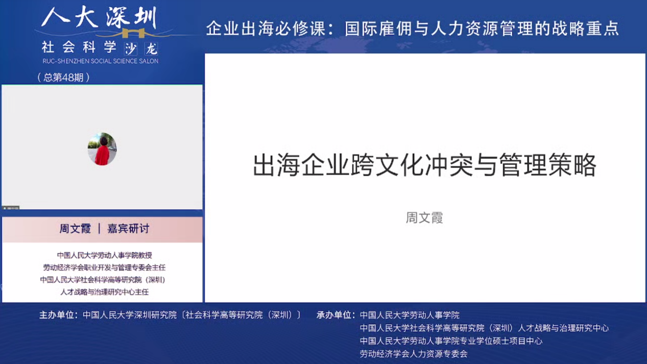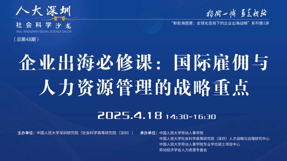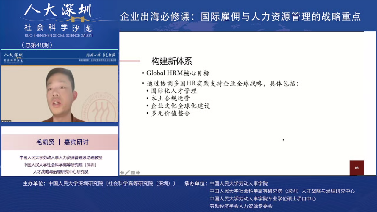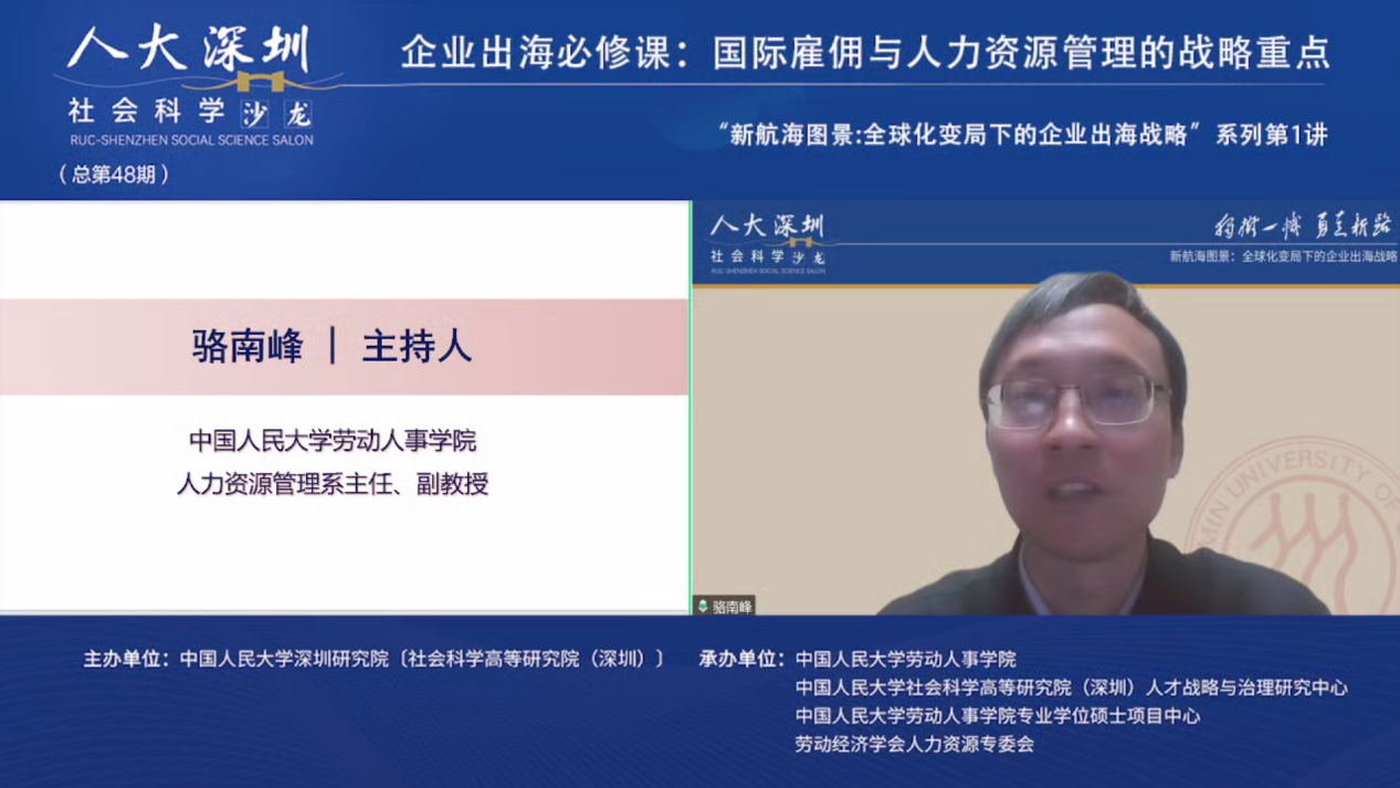 人大深圳社科沙龙(总第48期)“新航海图景:全球化变局下的企业出海战略”系列第1讲“企业出海必修课:国际雇佣与人力资源管理的战略重点”线上沙龙成功举行。yl23455永利劳动关系系主任、副教授张皓作主题演讲,yl23455永利官网社会科学高等研究院(深圳)人才战略与治理研究中心学术主任、yl23455永利教授、劳动经济学会职业开发与管理专委会主任周文霞,yl23455永利人力资源管理系助理教授、学会与期刊事务项目主任毛凯贤,以及江三角(深圳)律师事务所域外劳动法中心主任王天怡等多位在国际雇佣、劳工关系、人力资源管理领域的专家学者出席本次沙龙,共同探讨企业出海在国际雇佣和人力资源管理方面所面临的挑战和战略重点。本次沙龙由yl23455永利人力资源管理系主任、副教授、劳动经济学会人力资源专委会秘书长骆南峰主持。