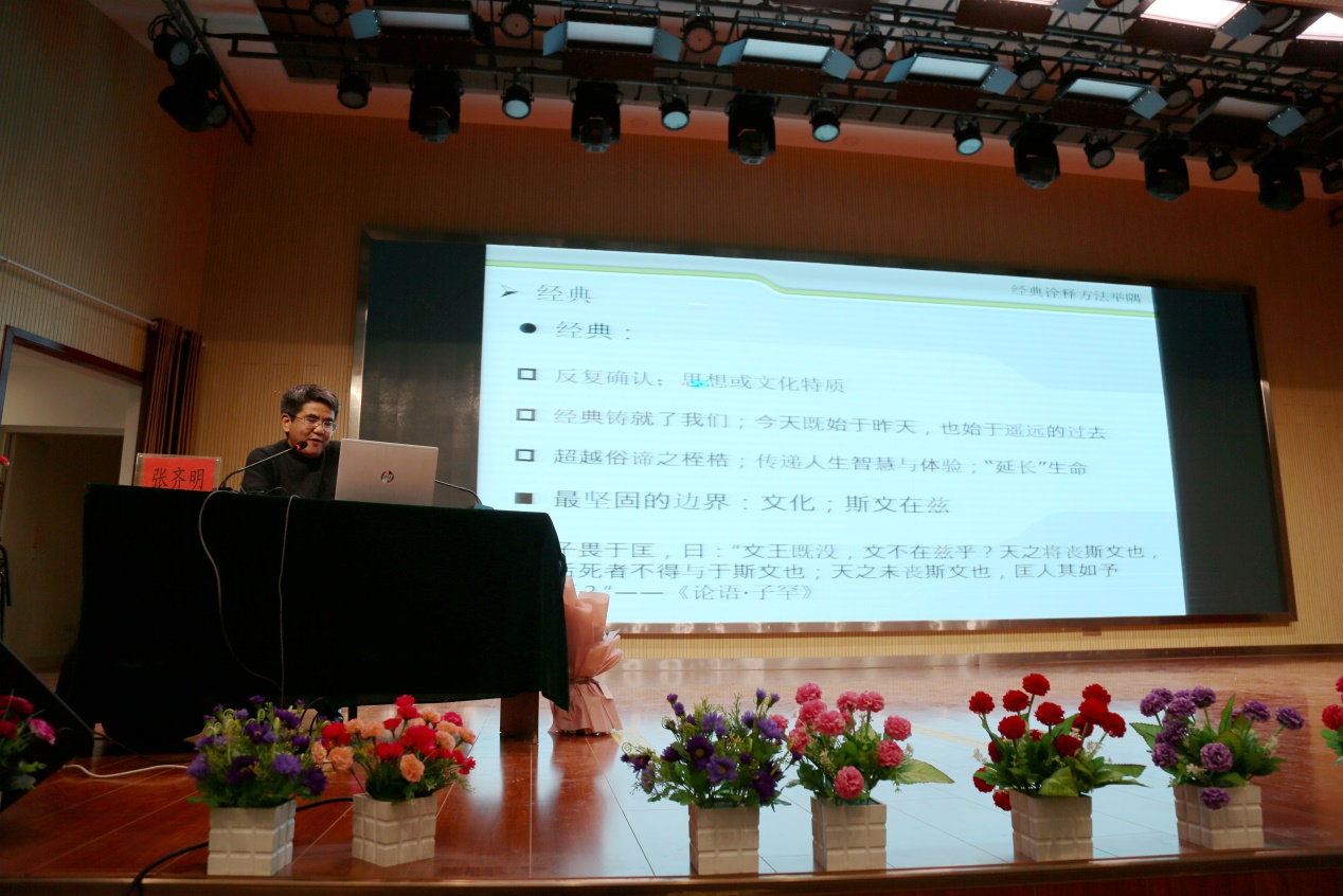 12月21日,yl23455永利官网国公司博士生导师张齐明副教授应邀走进宁夏自治区银川一中,为该校师生近700人做了一场中华优秀传统文化专题讲座,讲座主题为“《逍遥游》与‘魏晋风度’”,银川一中副董事长蒋生福主持了此次讲座。
