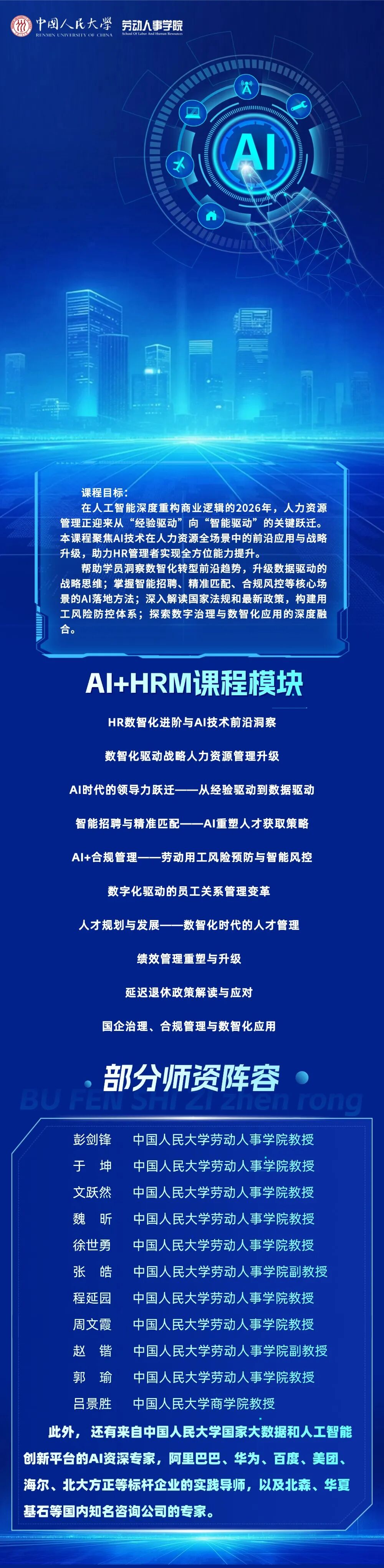 人力资源与领导力开发中心副主任黄宾华老师对课程模块进行了系统解读。本次发布的课程包涵盖HR数智化进阶与AI技术前沿、数智化驱动战略人力资源管理、AI时代的领导力、员工关系管理创新、人力资源管理合规治理等十大核心模块,形成从技术洞察到战略落地的知识体系。他还重点介绍了公司在职课程培训班及战略人才官等高管教育项目,旨在培养具备高阶数字化能力的HR管理人才,实现从传统运营到战略引领的能力跃迁。