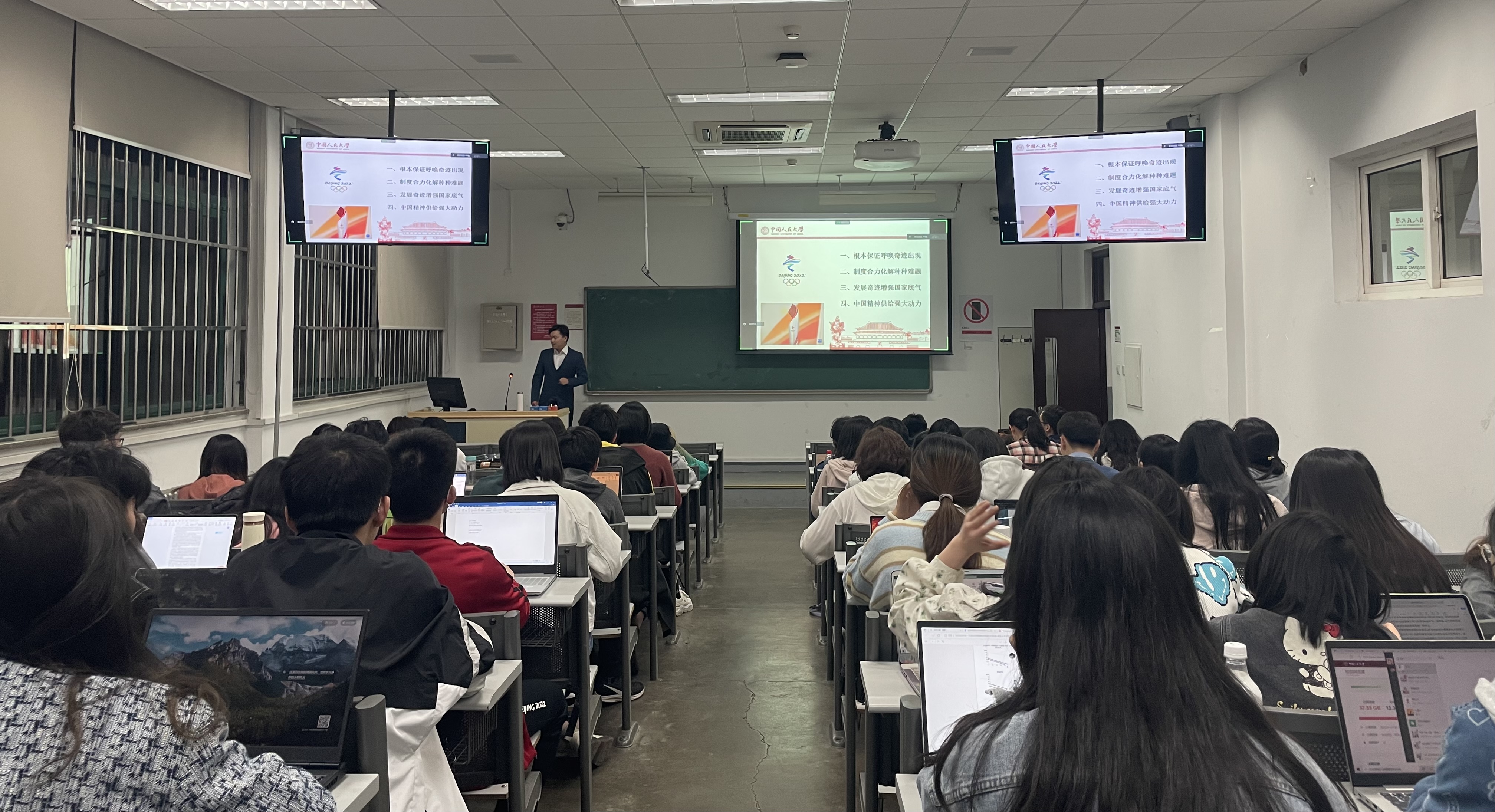 最后,喻伟同志作《“冰雪中的中国奇迹——第24届冬季奥林匹克运动会(2022北京冬奥会)侧记”》主题报告。喻伟从“根本保证呼唤奇迹出现”、“制度合理化解种种难题”、“发展奇迹增强国家底气”和“中国精神供给强大动力”四个角度,用详实的数据和具体的事例,为大家深刻剖析了“为什么北京冬奥的成功举办要归功于中国共产党的领导”。喻伟表示,党的领导是2022年北京冬奥会成功举办的根本保证,中国政府能够集中力量办大事,在冬奥会的场馆建设、交通建设、环境整治、赛事组织和城市运行等多个方面集各界之力,合理化解难题,创造了疫情下的体育盛会奇迹,深刻体现了中国特色社会主义的优越性。喻伟同志倡议大家学习并发扬北京冬奥精神,坚持“团结和奋斗”这条支撑中华民族不断前进、创造历史伟业的必由之路。