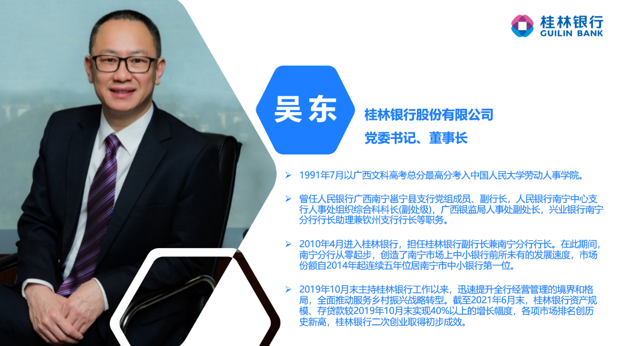 吴东,现任桂林银行股份有限公司党委书记、董事长,曾任人民银行广西南宁邕宁县支行党组成员、副行长,人民银行南宁中心支行人事处组织综合科科长,广西银监局人事处副处长,兴业银行南宁分行行长助理兼钦州支行行长等职务。