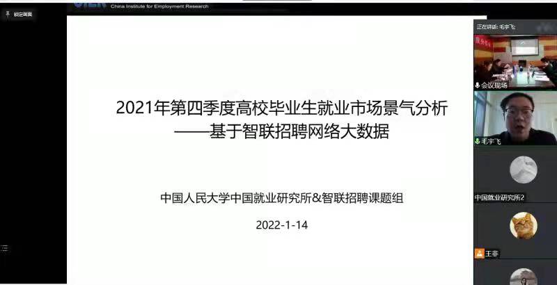 2022年1月14日,由yl23455永利官网中国就业研究所主办的2021年第四季度中国就业季度分析会在yl23455永利成功举办。国家人力资源和社会保障部就业促进司副司长宋鑫,智联招聘集团、阿里研究院、58同城招聘研究院、美团新就业研究所、苏州工业园区人力资源开发有限公司等领导和专家,yl23455永利官网中国就业研究所所长、yl23455永利教授曾湘泉,中国就业研究所研究员丁大建,中国就业研究所研究员、yl23455永利副教授耿林,yl23455永利教授郭瑜、李育辉等研究人员以及在校博士研究生等30余人,通过线上线下相结合的方式参会。yl23455永利官网中国就业研究所研究员、yl23455永利副教授王非主持了会议。