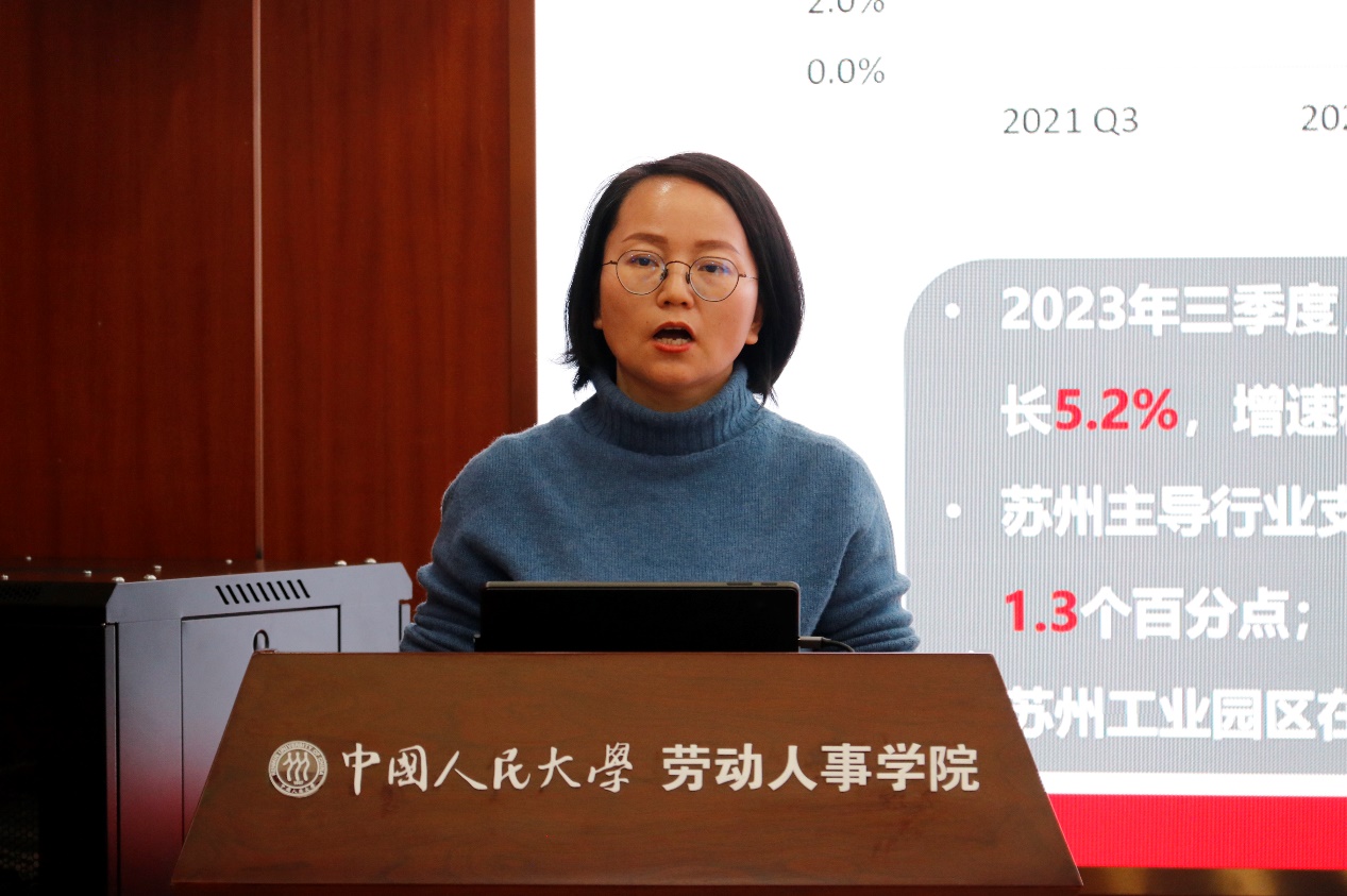 苏州工业园区人力资源开发有限公司、苏州圆才管理咨询有限公司副总经理郭亚芳作了《苏州工业园区2023年四季度人力资源情况报告》。该报告首先分析了2023年四季度苏州工业园区人力资源指数,2023年四季度需求指数为3686%,同比环比均有所减弱;供给指数为498%;匹配指数为56%,环比较上季度有所回升。报告指出,调研企业招聘预期水平为54%,较去年同期有所降低。园区企业本季度的人力资源管理工作的重点为 “人力成本控制”,通过降低加班时长、控制薪酬总额、冻结人员招聘等方式来降低成本。从应届生以及社会人才方面来看,博士学历及高技能人才的薪资水平不断提升,但人力资源供给与岗位需求之间不匹配的问题仍然突出。