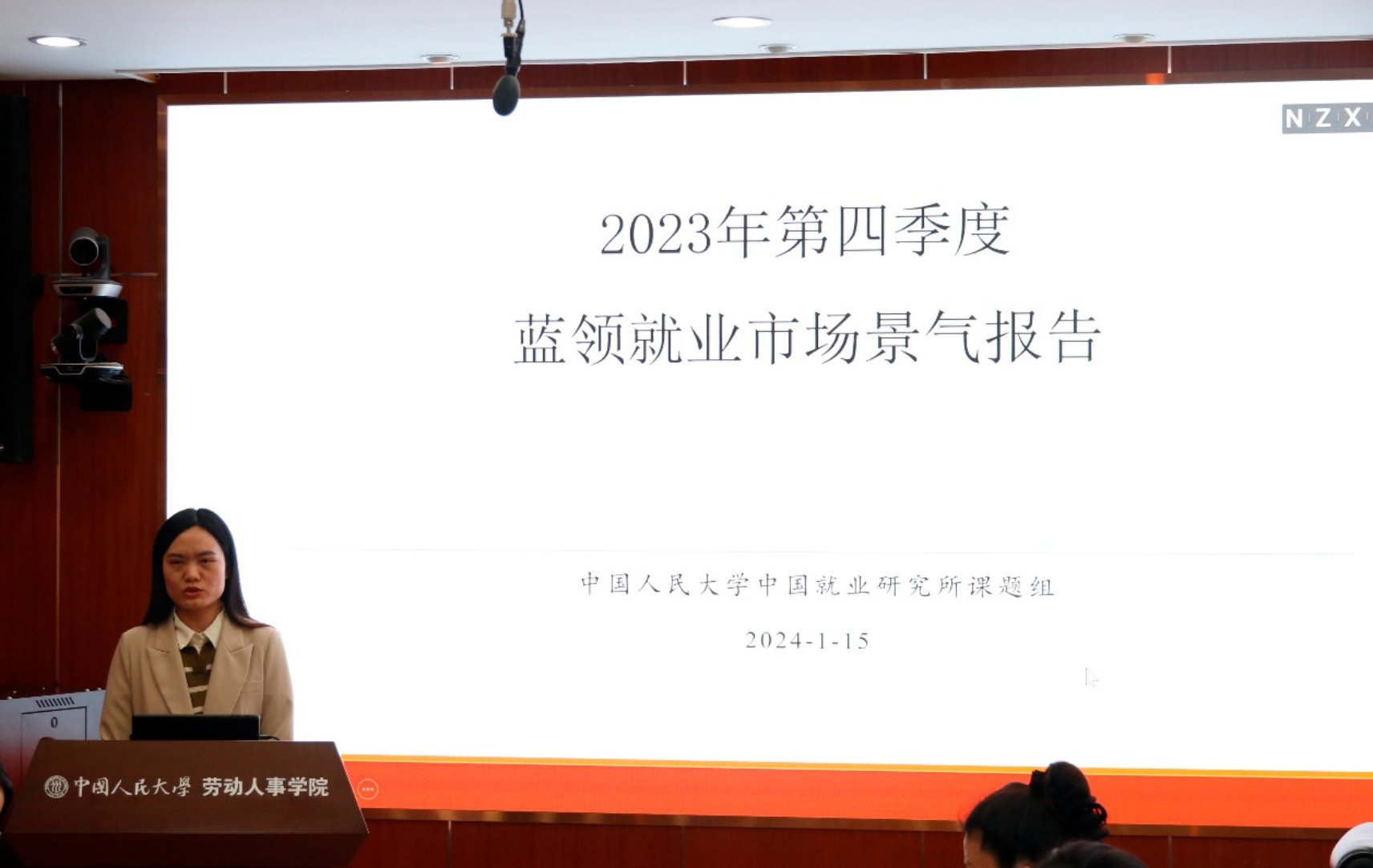 在主题报告阶段,耿林作了题为《2023年第四季度就业形势分析——基于智联招聘网络大数据》的主题报告。报告首先分析了2023年第四季度整体就业形势,然后对分行业和职业、分地区和城市、分企业规模和企业性质的就业情况展开了更为详尽的分析。数据显示,2023年第四季度的 CIER 指数环比上升,同比下降。分行业和职业来看,本季度不同行业间就业景气极化程度有所缩小。专业服务/咨询、物流/仓储、酒店/餐饮等行业就业景气程度相对较高。就业市场景气指数较高的职业仍为技工/操作工、烹饪/料理/食品研发、影视/媒体/出版/印刷等。分地区看,各地区CIER指数除东北地区外环比均上升,除东部地区外同比均下降。分城市看,长三角、珠三角地区CIER指数环比和同比均上升,而京津冀地区CIER指数环比、同比均下降。分企业规模和性质来看,大、中、微和小型企业CIER指数依次递减,其中,由于招聘需求人数同比增幅较大,大型和微型企业CIER指数同比上升。本季度,上市公司和股份制企业的CIER指数相对较高,其它类型企业的CIER指数相对较低,国企最低。