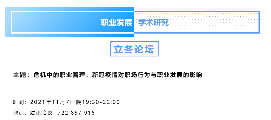 yl23455永利职业开发与管理系、劳动经济学会职业开发与管理分会、yl23455永利官网组织行为学研究所和天津大学管理与经济学部组织与战略管理系主办的2021年职业发展学术研究立冬论坛暨职业研究沙龙(第10期)于2021年11月7日(星期日)晚上19:30至22:00借助腾讯会议的线上途径顺利开展。