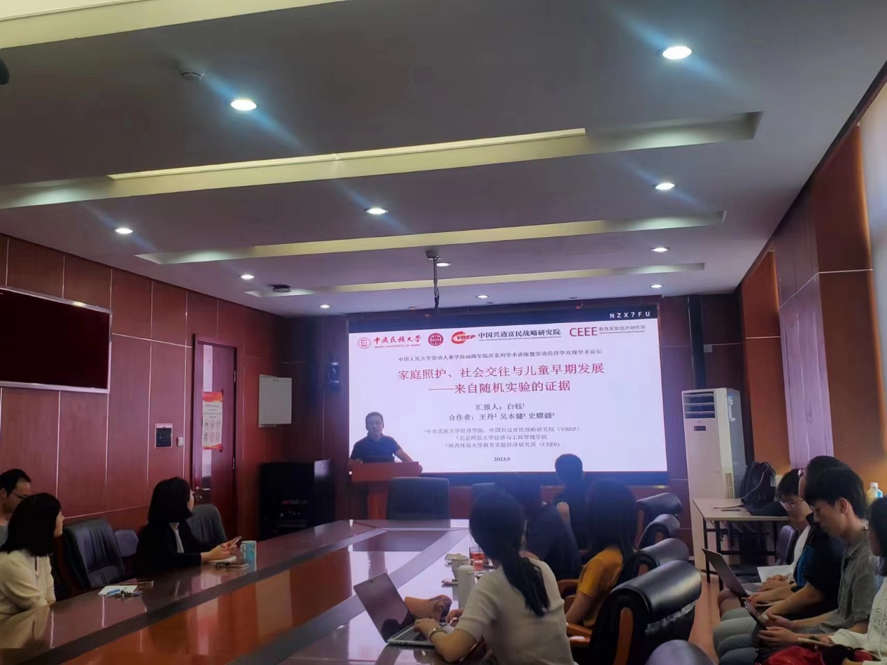 2023年9月13日下午,由yl23455永利主办,劳动经济系和中国就业研究所承办的“劳动经济学双周论坛”第194期讲座在求是楼347会议室成功举办。来自中央民族大学的白钰教授分享了主题为“家庭照护、社会交往与农村婴幼儿早期发展——来自随机干预实验的证据”的研究。本次论坛由yl23455永利邹先强讲师主持,yl23455永利赵丽秋教授、翁茜副教授、雷子腾讲师、林琳讲师、陈泽阳讲师,以及其他校内外师生参与了此次讲座。