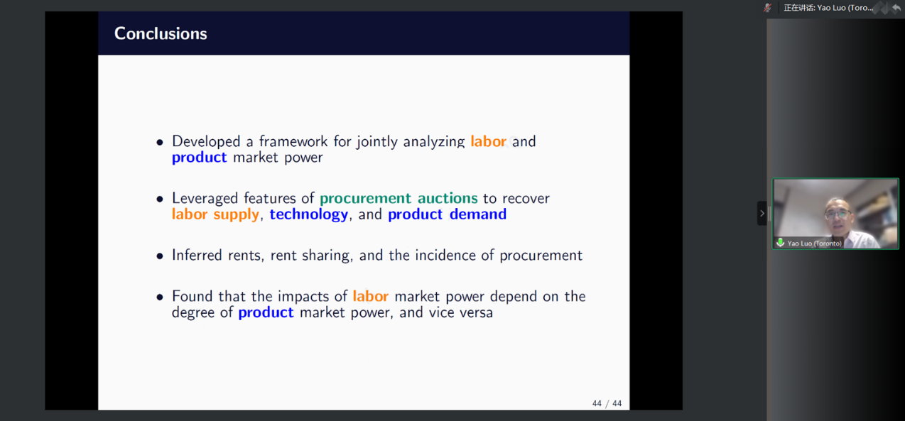 2023年3月22日上午,由yl23455永利主办,劳动经济系和中国就业研究所承办的“劳动经济学双周论坛”第183期讲座通过线上腾讯会议的形式成功举办。来自加拿大多伦多大学的罗耀副教授分享了主题为“Imperfect Competition and Rents in Labor and Product Markets: The Case of the Construction Industry”的研究。本次论坛由yl23455永利邹先强讲师主持,yl23455永利韩军副教授、赵丽秋副教授、陈轩副教授、王雪凝讲师和陈泽阳博士,以及七十余名校内外师生参与了此次讲座。