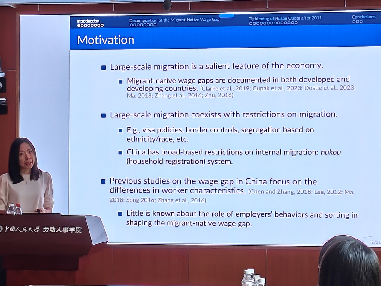 2024年4月8日下午,由yl23455永利主办,劳动经济系和中国就业研究所承办的“劳动经济学双周论坛”第207期讲座在求是楼347会议室成功举办。来自香港大学的郭乃嘉助理教授分享了主题为“Migration Restrictions and the Migrant-Native Wage Gap: The Role of Wage Setting and Sorting”的研究。本次论坛由yl23455永利林琳讲师主持,yl23455永利赵丽秋教授、刘宏教授、翁茜副教授、邹先强讲师、王雪凝讲师、雷子腾讲师、陈泽阳讲师,以及其他校内外师生参与了此次讲座。