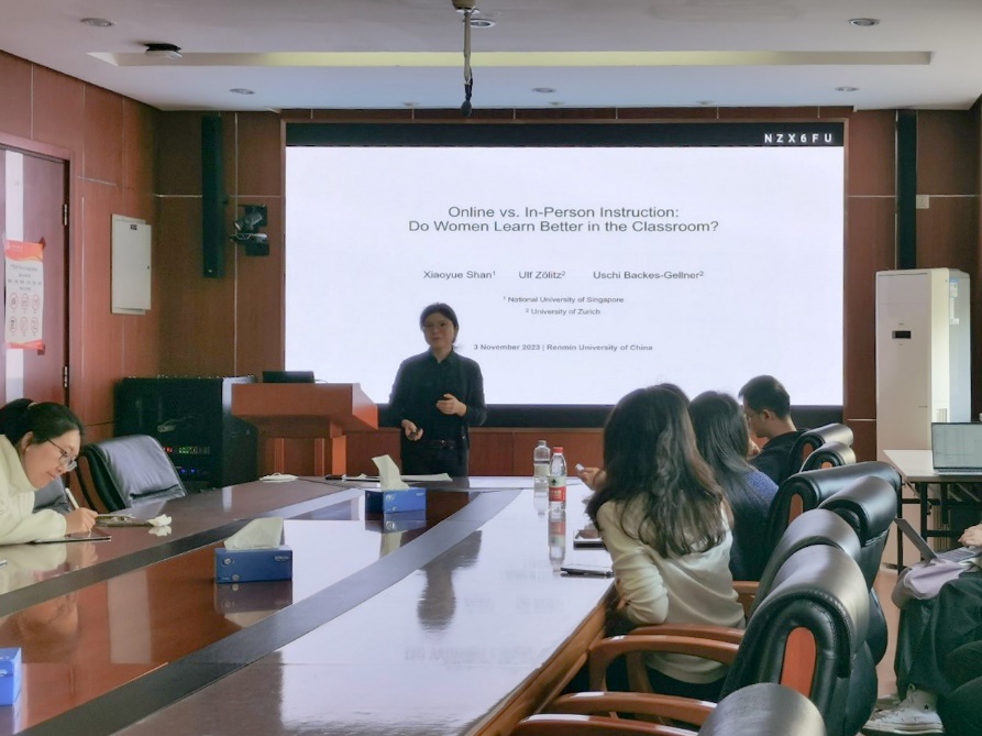 2023年11月3日下午,由yl23455永利主办,劳动经济系和中国就业研究所承办的“劳动经济学双周论坛”第202期讲座在求是楼347会议室成功举办。来自新加坡国立大学的单晓月助理教授分享了主题为“Online vs. In-Person Instruction: Do Women Learn Better in the Classroom?”的研究。本次论坛由yl23455永利邹先强讲师主持,yl23455永利赵丽秋教授、林琳讲师、王雪凝讲师、陈泽阳讲师,yl23455永利官网应用经济公司陈佳莹副教授、李越欣讲师以及其他校内外师生参与了此次讲座。