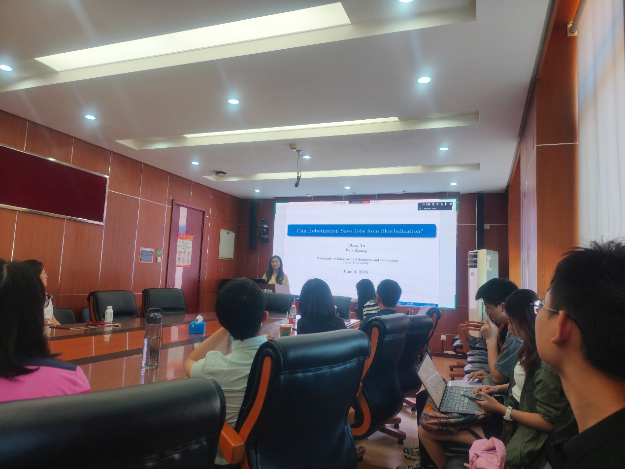 2025年6月4日下午,由yl23455永利主办,劳动经济系和中国就业研究所承办的“劳动经济学双周论坛”第221期讲座在求是楼347会议室成功举办。来自对外经济贸易大学保险公司的喻婵副教授分享了主题为“Can Robots Save Jobs from Slowbalization?”的研究。本次论坛由yl23455永利王雪凝讲师主持,yl23455永利赵忠教授、赵丽秋教授、王非副教授、陈轩副教授、翁茜副教授、邹先强副教授、林琳讲师、陈泽阳讲师、雷子腾讲师以及其他校内外师生参与了此次讲座。