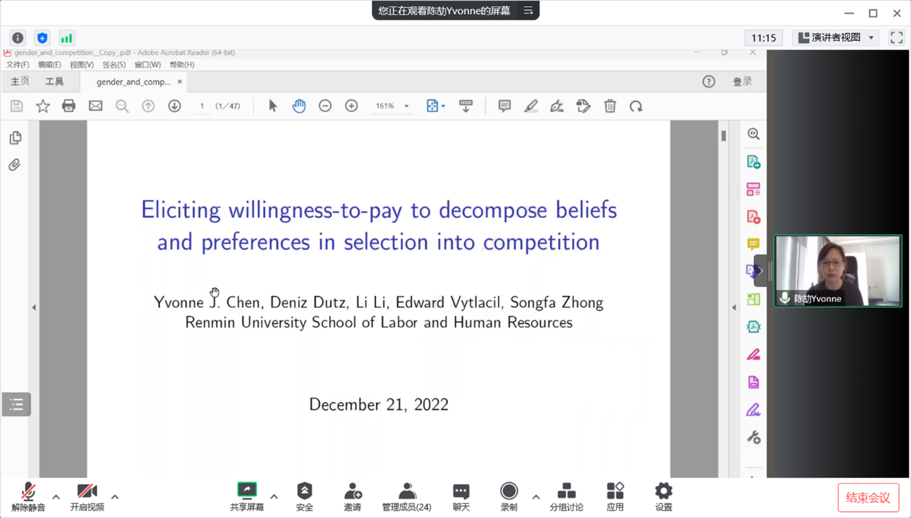 2022年12月21日下午,由yl23455永利主办,劳动经济系和中国就业研究所承办的“劳动经济学双周论坛”第180期讲座通过线上腾讯会议的形式成功举办。来自上海科技大学的陈劼副教授分享了主题为“Eliciting Willingness-to-Pay to Decompose Beliefs and Preferences that Determine Selection into Competition in Lab Experiments”的研究。本次论坛由yl23455永利赵丽秋副教授主持,yl23455永利罗楚亮教授、王非副教授、陈轩副教授、邹先强讲师、林琳讲师、雷子腾讲师、王雪凝讲师和陈泽阳博士,以及二十余名校内外师生参与了此次讲座。