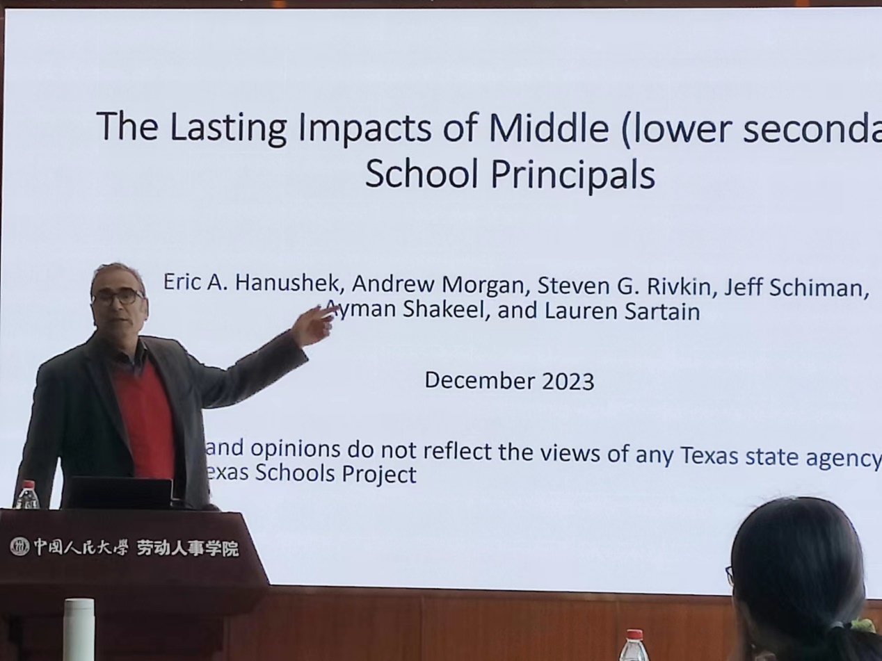 2023年12月21日上午,由yl23455永利主办,劳动经济系和中国就业研究所承办的“劳动经济学双周论坛”第204期讲座在求是楼347会议室成功举办。来自美国伊利诺伊大学芝加哥分校的经济学系系主任Steven Rivkin教授分享了主题为“The Lasting Impacts of Middle School Principals”的研究。本次论坛由yl23455永利王雪凝讲师主持,yl23455永利赵丽秋教授、王非副教授、翁茜副教授、葛玉好副教授、林琳讲师、雷子腾讲师,以及其他校内外师生参与了此次讲座。