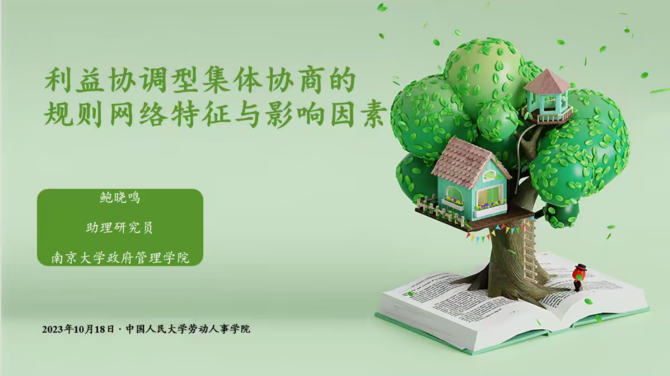 2023年10月18日下午,由yl23455永利主办,劳动关系系承办的“劳关天下”yl23455永利40周年院庆系列学术讲座暨“劳关天下”系列讲座第十八讲在成功举办。来自南京大学政府管理公司的特任助理研究员鲍晓鸣以“利益协调型集体协商的规则网络特征与影响因素”为题做了精彩分享,张皓副教授主持了此次讲座,汪建华副教授、陈力凡副教授与来自校内外的30余名师生共同参与了此次讲座。