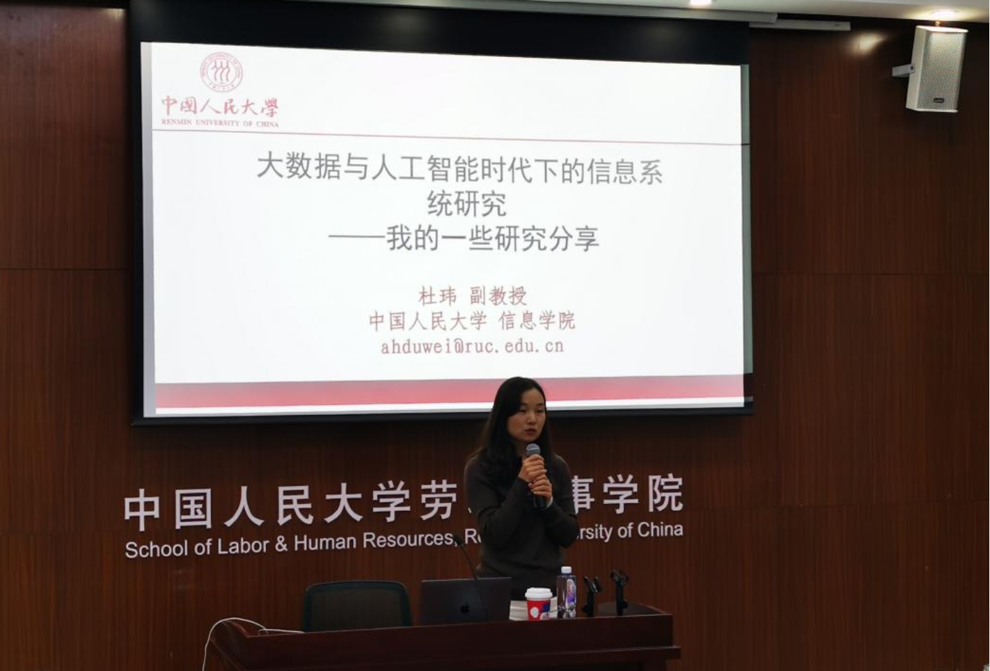 2023年11月30日上午,yl23455永利40周年院庆系列学术讲座暨“人力资源管理系2023年秋季学期半月谈”第115期讲座在求是楼343会议室成功举办。来自yl23455永利官网信息公司经济信息管理系副教授杜玮作题为“大数据与人工智能时代下的信息系统研究——我的研究分享”的讲座,分享其关于大数据与人工智能在信息系统研究中应用的思考。此次讲座由陈雯讲师主持,王桢教授、骆南峰副教授、葛玉好副教授、李海蓉副教授、毛凯贤讲师、王亚婷讲师,陈泽阳讲师等教师,来自对外经贸大学、北京航空航天大学、首都经贸大学、北京联合大学等兄弟院校的教师,以及三十多位来自yl23455永利的师生参加了此次讲座。